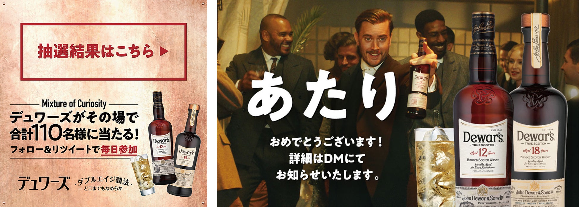 また、キャンペーンスタートを記念して、公式Twitter上で、フォロー&RTでデュワーズウイスキーがその場で当たるキャンペーンを開始。終了日の5月8日(日)まで、期間中毎日参加可能で、デュワーズ 18年(750ml)が10名に、デュワーズ 12年(700ml)が100名に、合計110名に当たります。