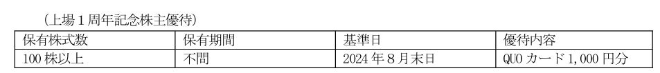 2024年11月に上場後1周年を迎えることとなり、株主の皆様の日頃のご支援に感謝の意を表すため、上場1周年記念株主優待を実施いたします。