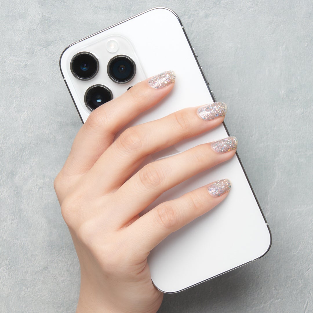 クリアベース(透明)に、大小様々なシルバーラメを敷き詰めたグリッターネイルです。光を受けた偏光ラメがミラーボールのような眩いきらめきを放ち、アナタの魅力を引き出します。華やかさもありつつ、色味はシルバーだけに絞っているので、モノトーンコーデやデニムなどのカジュアルファッションにも合わせやすいデザインです。