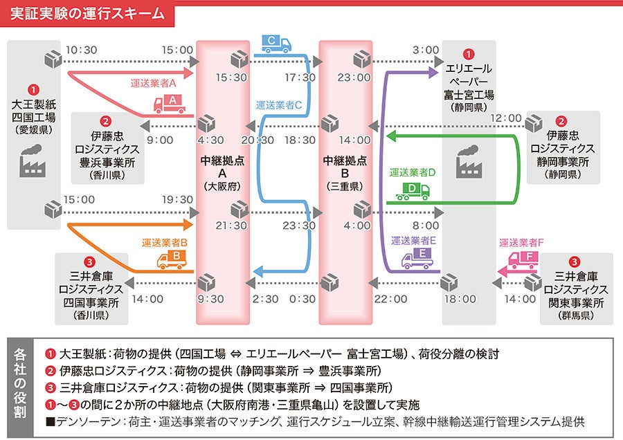 大王製紙株式会社(本社:東京都千代田区、代表取締役社長:若林 賴房)、伊藤忠ロジスティクス株式会社(本社:東京都港区、代表取締役社長:岡 広史)、三井倉庫ロジスティクス株式会社(本社:東京都中央区、代表取締役社長:鳥井 宏)、株式会社デンソーテン(本社:兵庫県神戸市、代表取締役社長:加藤 之啓)は、以下の運送事業者と協力し、商品を積載する荷台(コンテナ)部分を着脱できるスワップボディコンテナ車両を用いた異なる運送事業者間で、四国-関東間における中継輸送の実証実験を2022年3月7日~11日に実施しました。