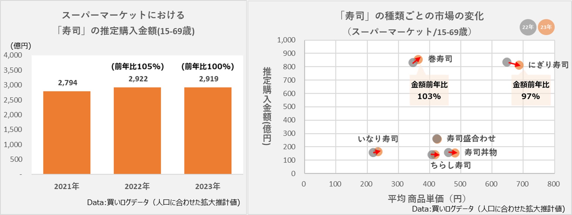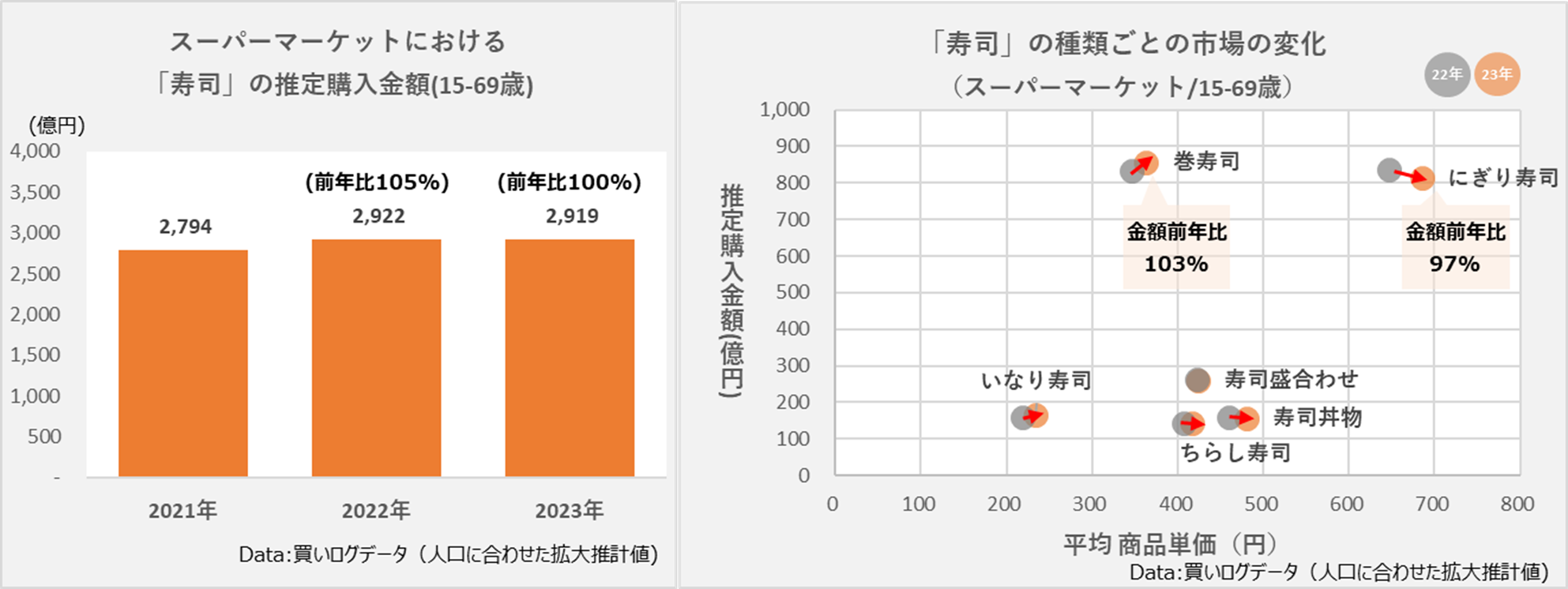 スーパーマーケットの「寿司」の推定購入金額のトレンドを見ると、2023年は前年比100%で横ばいとなりました。寿司の種類ごとに市場の変化を確認すると、「にぎり寿司」は前年比97%で縮小傾向、「巻寿司」は前年比103%で拡大しました。「にぎり寿司」は元々価格が高いところにさらに価格が上がり、買い控えられたと考えられます。「巻寿司」も価格が上がっていますが、元々寿司の中では価格が安いため、値上げの影響が少なかったということや、「にぎり寿司」から「巻寿司」にスイッチした可能性がありそうです。