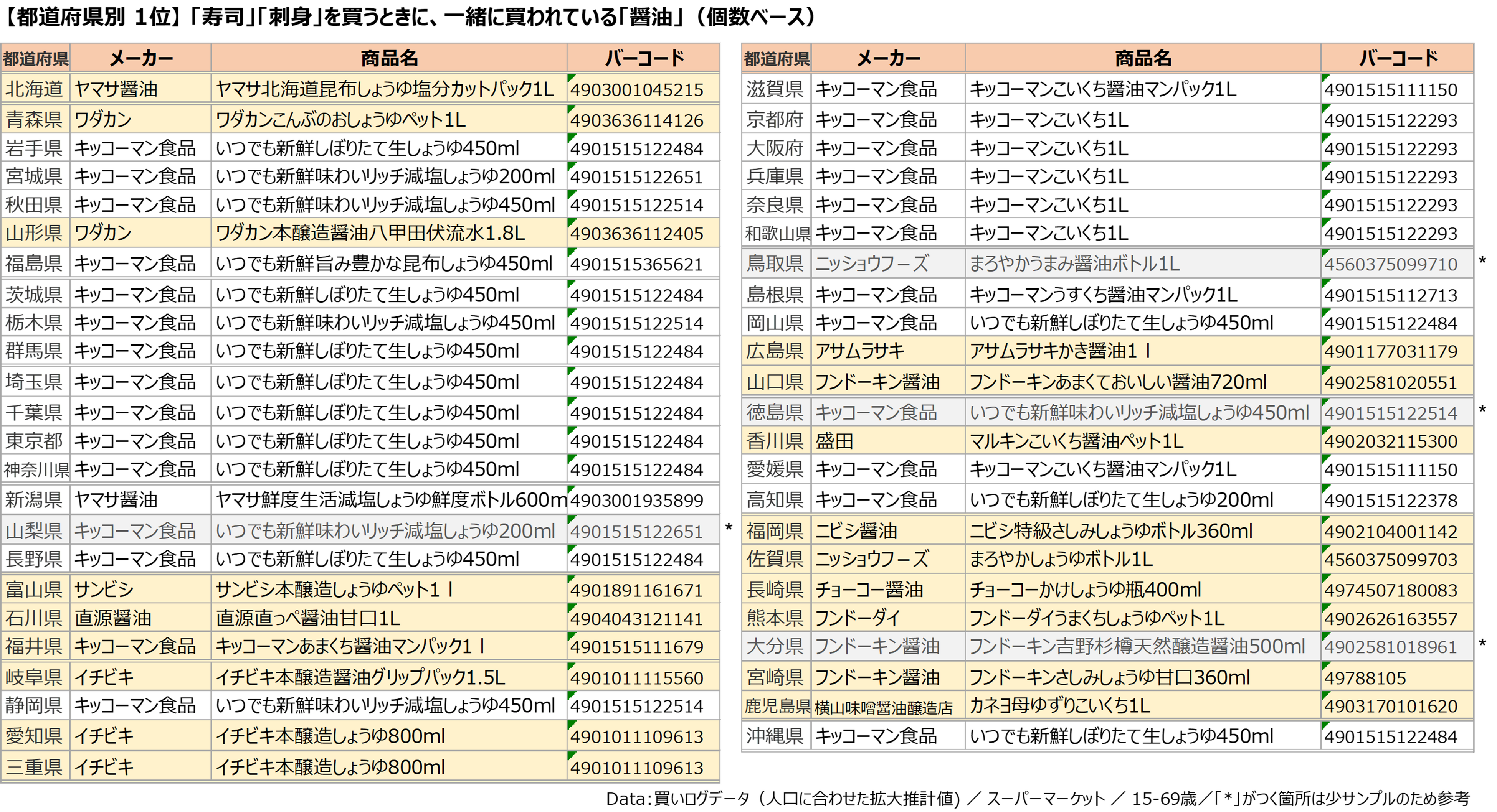 商品に期待しつつも、消費者として、もっと恵方巻を楽しむ方法は無いのでしょうか。我々は購買データを扱う企業として、その方法を考えました。それは「ご当地醤油」で楽しむことです。長さが売りの恵方巻きを、最後まで楽しんで食べきるための鍵は、「醤油」と言っても過言ではありません。そこで気になるのは、全国各地で愛されている「ご当地醤油」です。そもそもエリアによって食文化が変わる日本において、醤油をはじめとした調味料は「ご当地商品」が多く存在します。そんな各地でよく買われている醤油を試してみることで、恵方巻をさらに楽しめるのではないでしょうか。