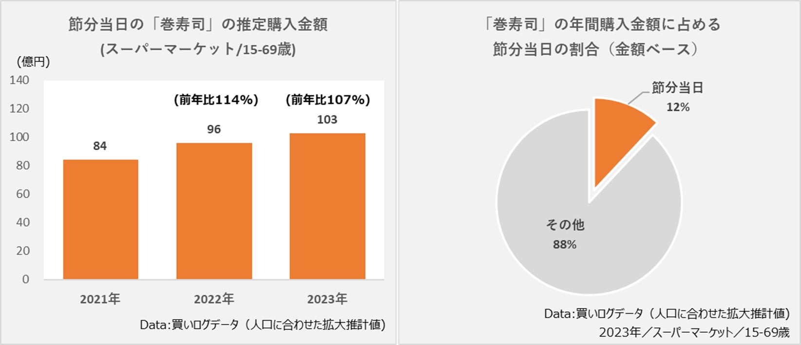 さて、巻寿司が一年間の中で最も買われる日と言えば、もちろん「節分」です。節分当日の巻寿司の購入金額のトレンドを見ると、伸長が続いていることが分かります。2023年の節分は107%の伸長で、前述の巻寿司の年間トータルの前年比の103%と比べても高い水準です。節分の恵方巻が巻寿司を牽引していることが分かります。
