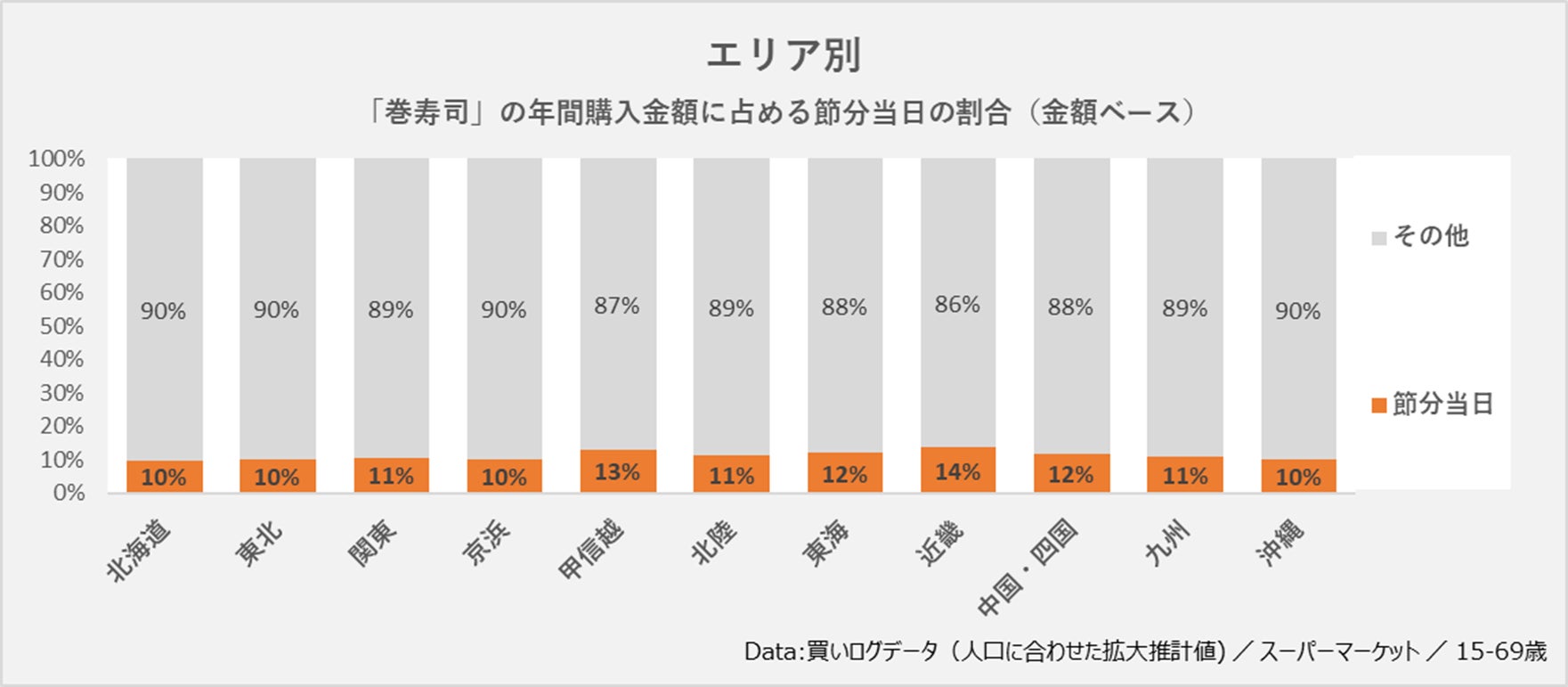 次のグラフは、先程のグラフと同様に、年間の中で節分当日が占める割合を、エリア別に確認したものです。これを見ると近畿地方では他のエリアよりも割合が大きく、節分当日が14%を占めています。確かに、関西圏の方が、恵方巻が買われやすい傾向があると考えられ、発祥地と言われていることも頷けます。一方で他のエリアでも節分当日の割合が10%以上を占めており、全国的に広がっている食文化と言えそうです。