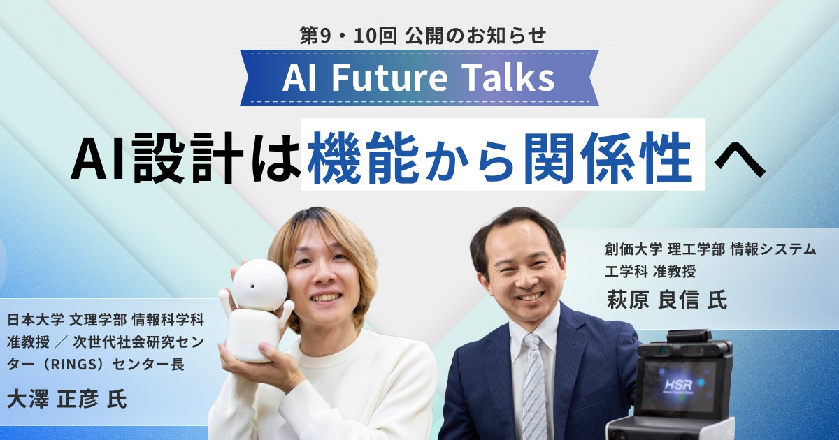 今回登場するのは、汎用人工知能(AGI)研究者として「ドラえもん」の実現に本気で挑む大澤 正彦 氏(日本大学)と、人とAIが真のパートナーとして共存する社会を目指し記号創発ロボティクスを研究する萩原 良信 氏(創価大学)の2名です。ともに気鋭の若手研究者で、AIと人間の関係の「本質」に最前線から迫る2つの視点が凝縮された対談です。