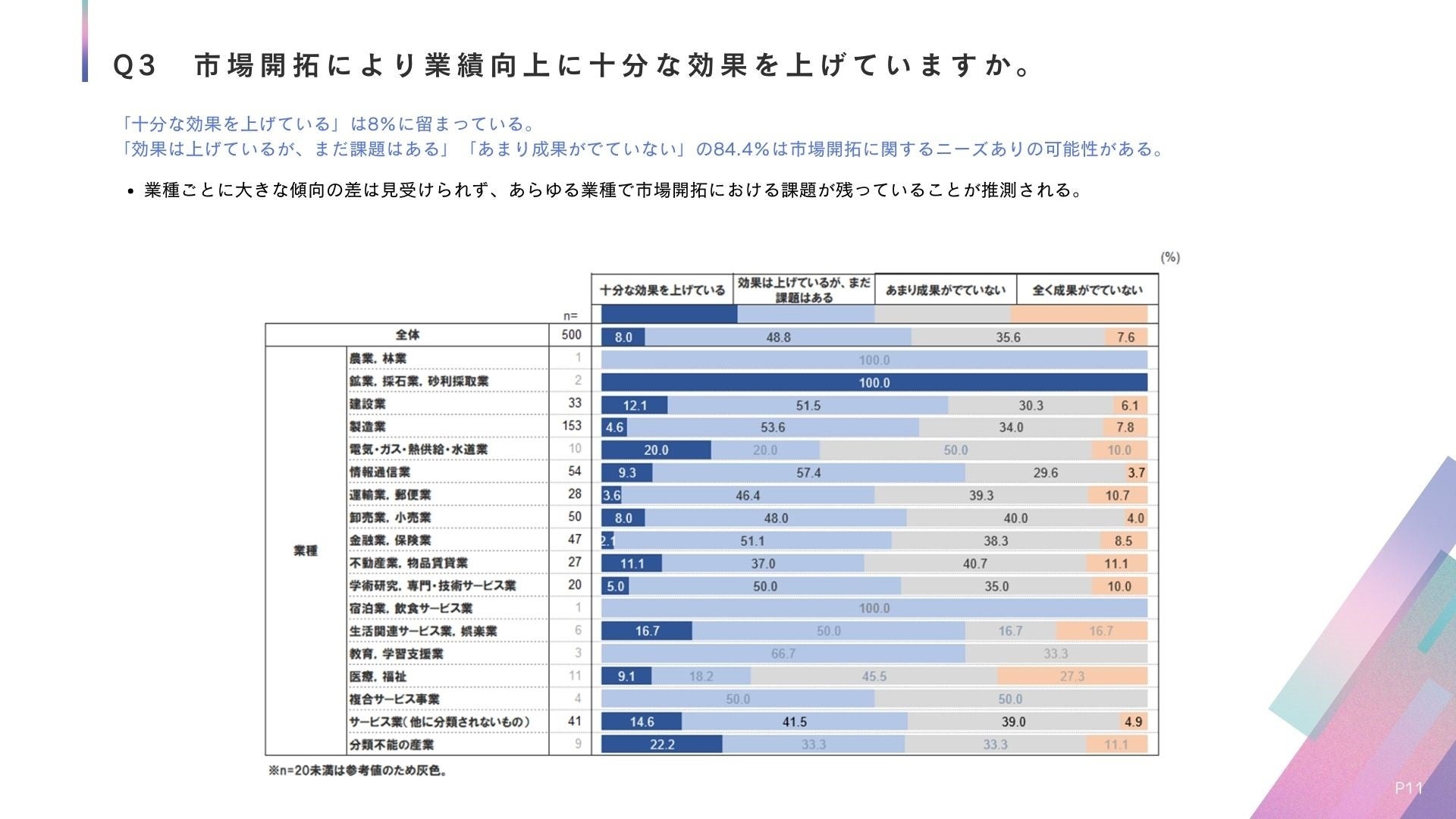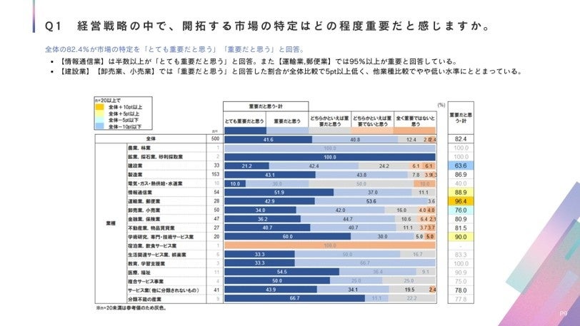 ▼市場の開拓は、全体の8割が「事業の成長に対して重要」だと認識している一方、市場開拓の効果に関して、「業績向上に十分な効果を上げているか」との問いに対して「十分」とする回答は1割以下。約8割が「効果は上げているが、まだ課題はある」などと回答。