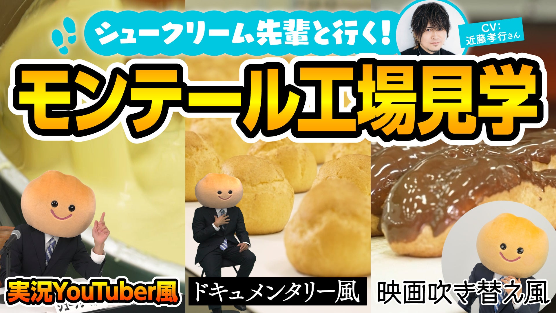 シュークリーム先輩(CV:近藤孝行)と行くモンテール工場見学動画を10月19日(水)に大公開!「実況YouTuber風」「ドキュメンタリー風」「映画吹き替え風」と声色が変化!?