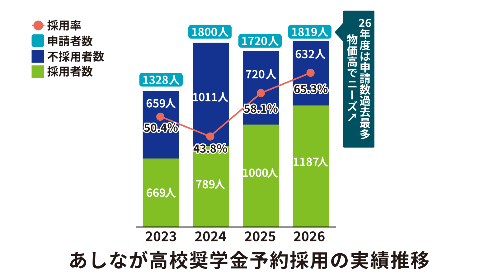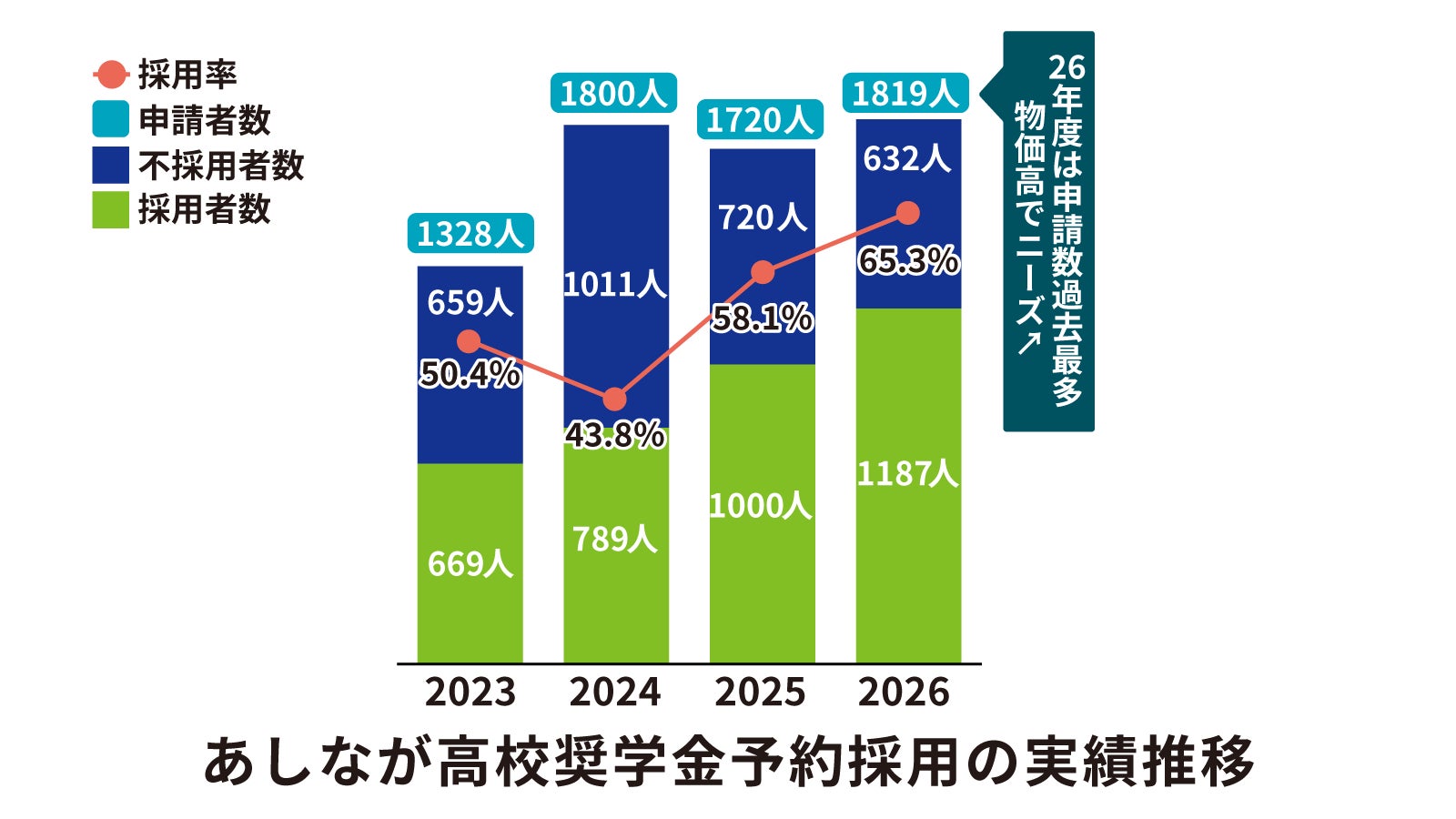 あしなが高校奨学金予約採用の申請数は、2023年度が1328人だったのに対し、24年度は1800人、25年度は1720人、そして26年度は1819人と、過去最多水準が3年間続いています。今回の予約採用で不採用となった34.7%の申請者も苦しい生活状況にあり、奨学金が必要であることは変わりません。