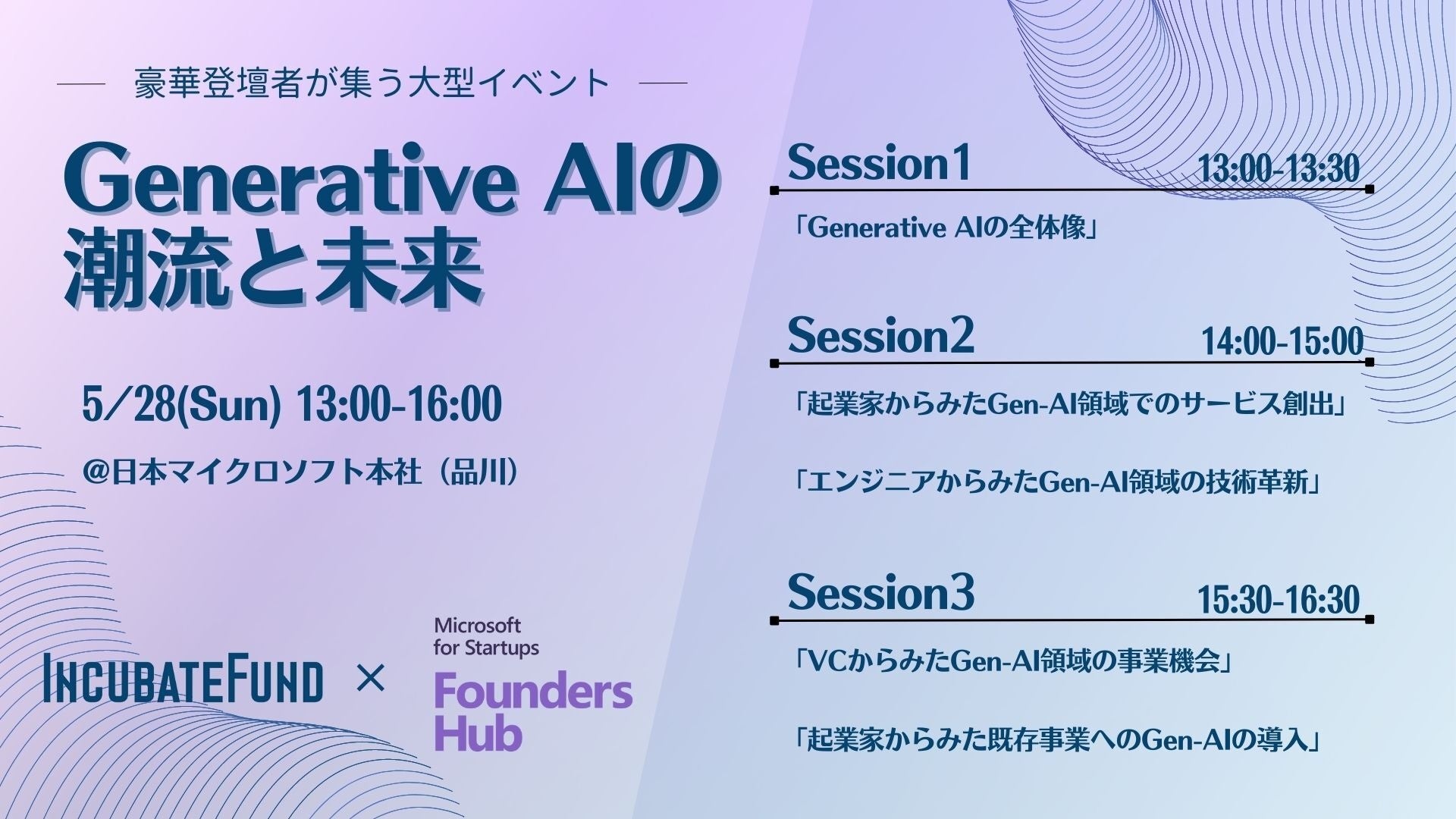 13:00-16:30 | Generative AIの潮流と未来 ※オープン開催・登壇者は追って公開 13:00-13:30 Session 1「Generative AIの全体像」 14:00-15:00 Session 2「起業家からみたGen-AI領域でのサービス創出」「エンジニアからみたGen-AI領域の技術革新」 15:30-16:30 Session 3「VCから見たGen-AI領域の事業機会」 「起業家からみた既存事業へのGen-AIの導入」 |