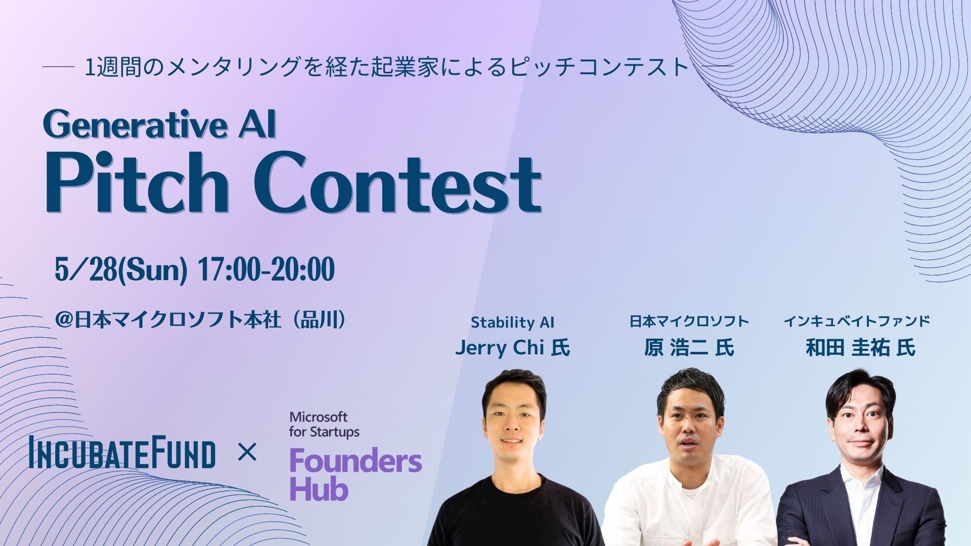 17:00-20:00 | Generative AIピッチコンテスト ※オープン開催 ▼審査員 「Stability AI Head of Japan」Jerry Chi氏 「日本マイクロソフト株式会社 コーポレートソリューション統括本部 クラウド事業開発本部長」原 浩二氏 「インキュベイトファンド株式会社 代表パートナー」和田 圭祐 |