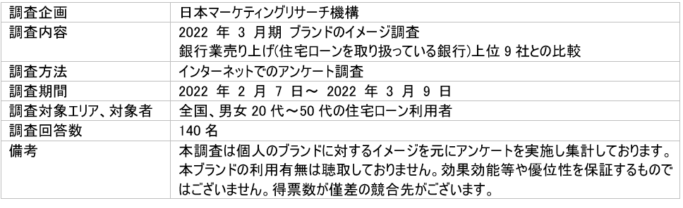 当行は、2022年3月に株式会社日本マーケティングリサーチ機構が行った住宅ローンのブランドイメージ調査において、「金利+諸費用が魅力の住宅ローン No.1」、「借り換えを検討したい住宅ローンNo.1」、「総支払額で選びたい住宅ローンNo.1」を獲得し“三冠”を達成いたしました。