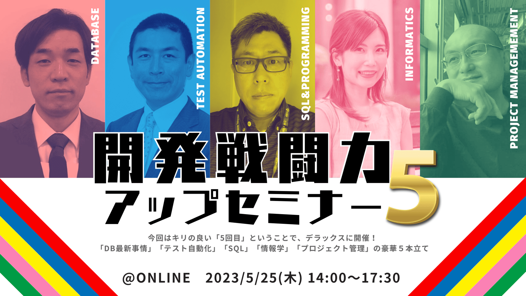 今回は記念すべき第5回目ということで、内容もこれまでよりパワーアップし、5つのITテーマをピックアップ。人気YouTuberをはじめとする各分野5名のスペシャリストが、「データベースの最新事情」「テスト自動化」「プロジェクト管理」「SQL」「IT人材と情報学」についてデラックスにお届けします。