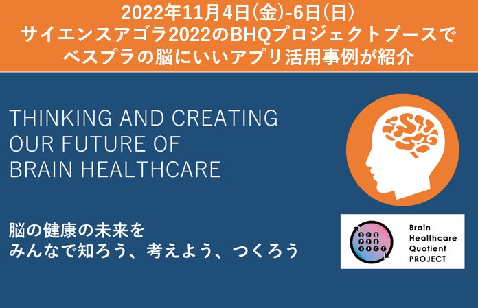 株式会社ベスプラ(東京都渋谷区、代表取締役CEO:遠山 陽介、以下:べスプラ)が提供するスマートフォンアプリ「脳にいいアプリ」を用いた事例が2022年11月4日(金)から6日(土)までテレコムセンタービルで開催の「サイエンスアゴラ2022」で出展されるBHQプロジェクトブースにて紹介されます。