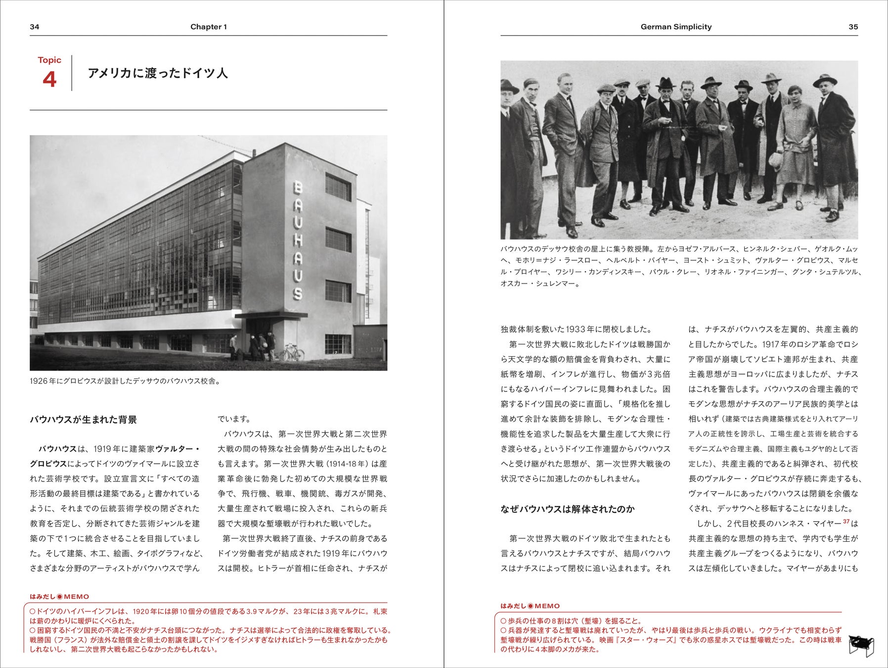 歴史を学ぶ際のジレンマは何か——。それは、世界中でいろいろなことが同時期に起こっているのに、それらを同時に学べないことではないでしょうか。ですから、それらを時系列に沿ってつなぎ合わせるという作業が必要になってきます。地域ごとの歴史を縦に並べ、あみだくじのように、それらの関係性を横に繫いでいくイメージです。そうすると歴史の全貌が見えてきます。たとえばスカンジナビアンデザインは、MoMAやエドガー・カウフマン Jr.が、アメリカで紹介したことをきっかけに注目され、その後黄金期を迎えたことや、当時渡米中だった剣持勇がそれに感化されて「ジャパニーズモダン」という思想を提唱した、といった具合に歴史は繫がっていくのです。(本書「はじめに」より一部抜粋)