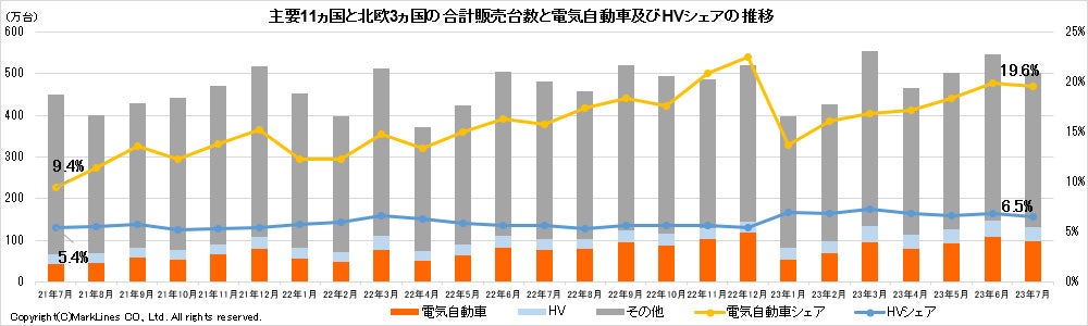 主要11カ国とノルウェー、スウェーデン、フィンランドの北欧3カ国(計14カ国)における7月の電気自動車販売台数は、98.3万台となった。前年同月比は29.5%増、前月比は9.6%減という結果になった。新車販売全体が減少する中、電気自動車の販売台数も減ったため、7月は100万台に届かなかった。