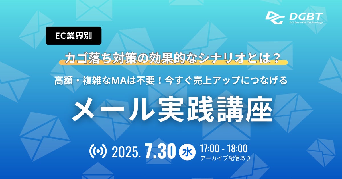 デジタルビジネス総合支援を手掛ける株式会社DGビジネステクノロジー(デジタルガレージグループ会社 /本社:東京都渋谷区、代表取締役 兼 社長執行役員:清水 和徳、以下:DGBT)は、2025年7月30日(水)に無料オンラインセミナー「高額・複雑なMAは不要、今すぐ売上アップにつなげるメール実践講座 ~EC業界別カゴ落ち対策の効果的なシナリオとは?~」を開催します。