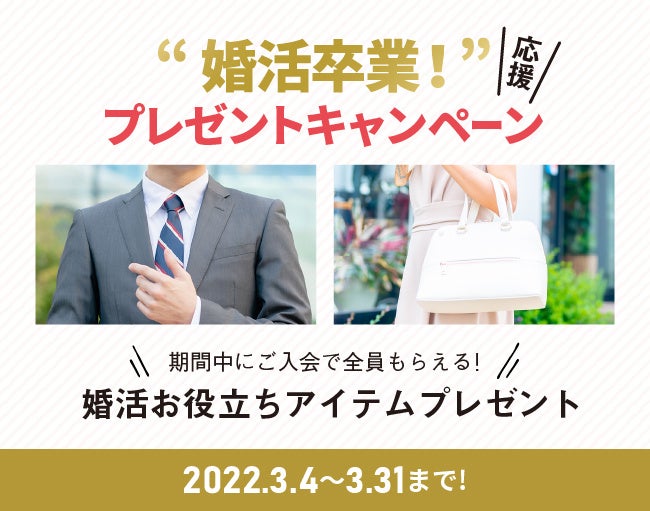 2022年から本気で婚活を卒業して結婚したいと考えている方へ“婚活卒業!応援キャンペーン”を実施いたします。2022年3月4日(金)~3月31日(木)までにご入会いただくと、婚活で役立つ便利アイテムが手に入ります。