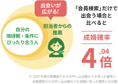 必要に応じて、婚活のプロならではの視点であなたの価値観とは違う、でもあなたに合うお相手の紹介を受けられることで、出会いの幅が広がります。