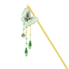 儚さを感じるような透け感のある蝶と、揺れに合わせ輝くビーズが印象的な一本簪です。