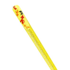 木軸全体にキラキラと輝く塗りを施し、トップの斜め切り部分には、尾ひれがひらりと華やかなに揺れる金魚をあしらいました。全体的に華やかで涼しげな仕上がりとなっています。コーディネートに合わせたり、重ね付けでも楽しめるよう空と黒の2色に加え、新色の紫と黄の全4カラー展開です。
