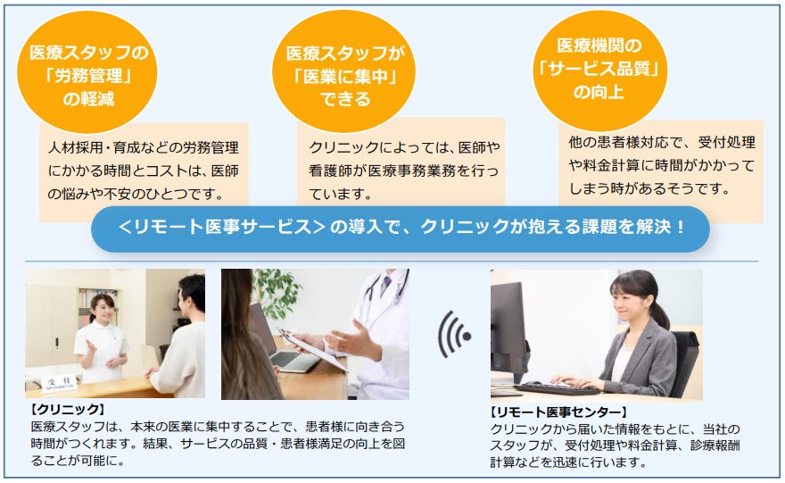 <リモート医事サービス>は、通常クリニック内で行われている受付処理や料金計算、診療報酬業務などの“医療事務業務”を、「リモート医事センター」(品川・名古屋・宇都宮の3拠点)で行うサービスです。センターでは、医療事務の専門スキルを持った当社のスタッフがオンラインでリアルタイムに対応するため、クリニックでは、最低限の事務スタッフでのオペレーションが可能です。また、リモート医事センターから医療事務業務を行うことで、患者様の待ち時間が減り、3密回避も期待できます。