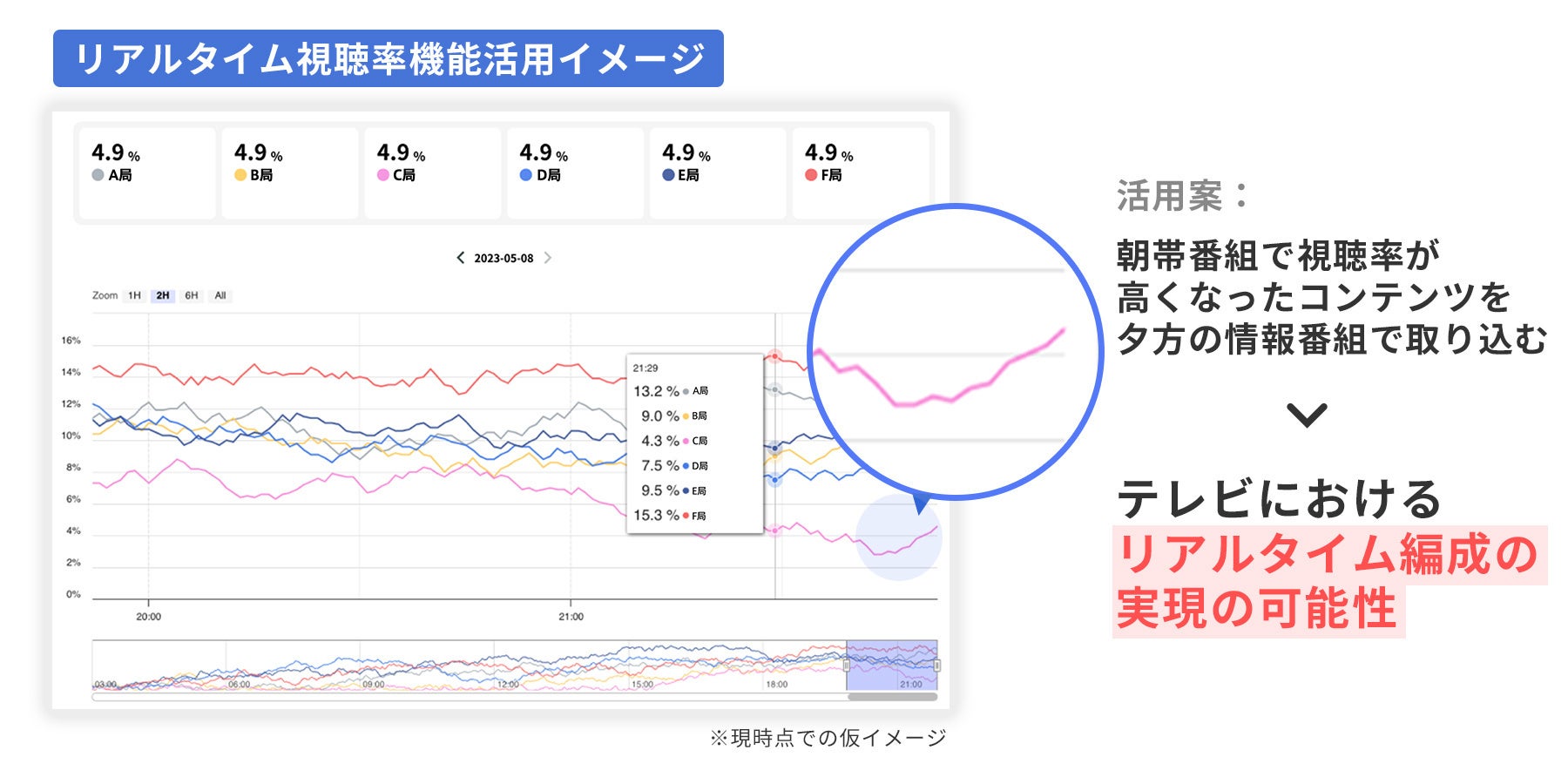 例えば、1時間以上の朝帯番組で視聴率が高かったコンテンツをリアルタイム視聴率で発見し、夕方の情報番組に盛り込むなど、様々な番組編成にお使いいただけます。