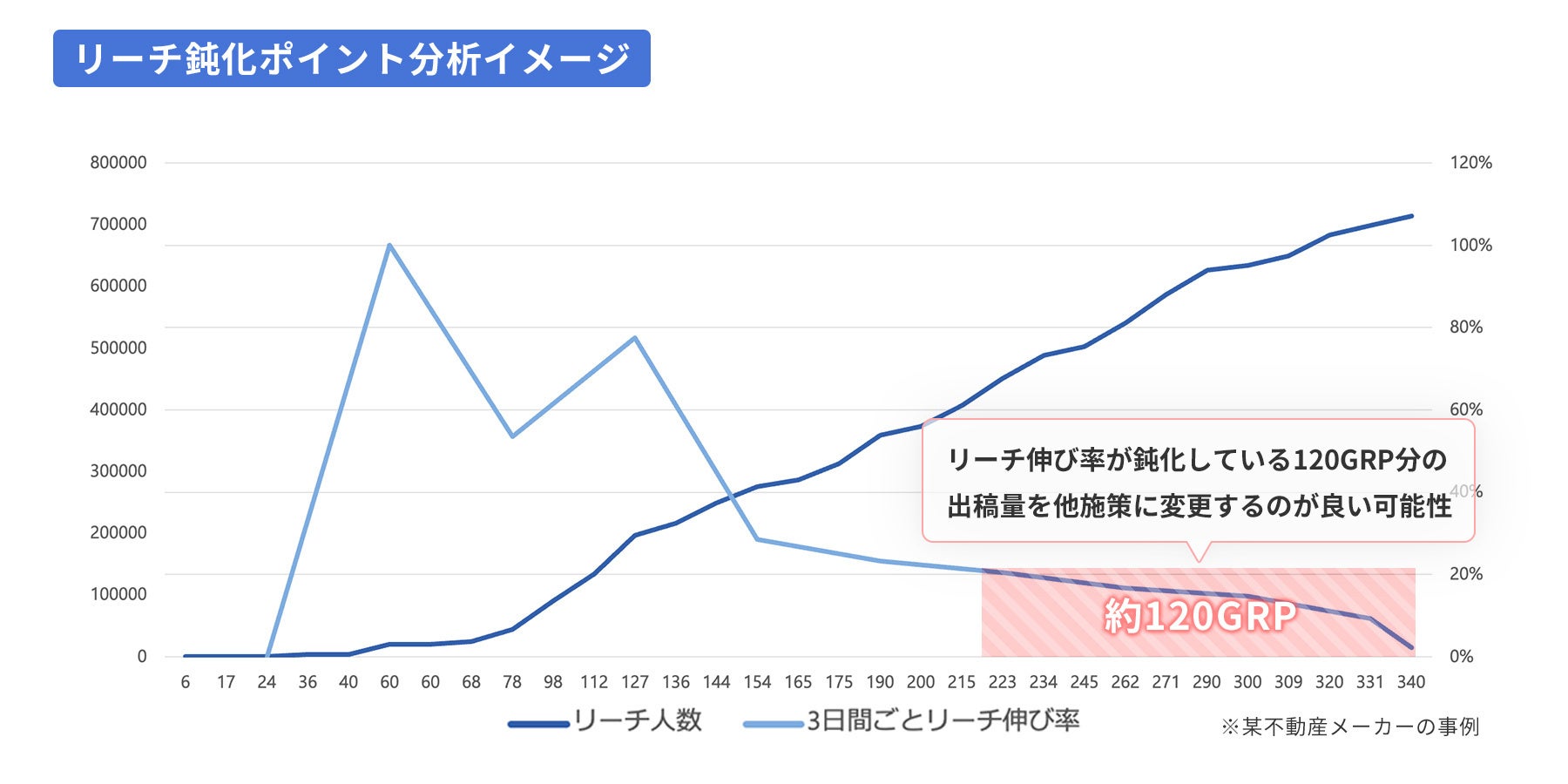 メ~テレでは、分析の結果、非効率な部分を特定し、ターゲットリーチが鈍化するポイントを可視化し、より効率的なCM枠の提案や、無駄になっているテレビCM出稿出稿分をデジタル広告や街頭サイネージ施策などメ~テレグループが保有する多彩なアセットを活用するプランに変更することで、広告出稿全体の効率を向上させるご提案が可能です。