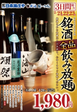 この2月から国をあげて開始される『プレミアムフライデー』。そこで「日本海庄や」では、この『プレミアムフライデー』のスタートを盛り上げるため、『プレミアムフライデー』直前の2月21日~23日の3日間限定で、厳選した銘柄日本酒を業界でも破格の1,980円(税別)という格安価格で飲み放題とする「極上銘柄日本酒飲み放題」を開催します。