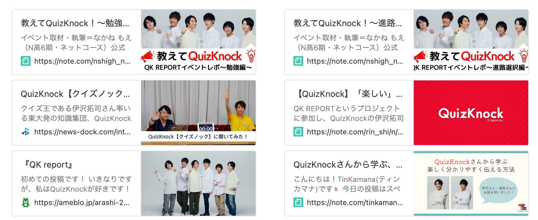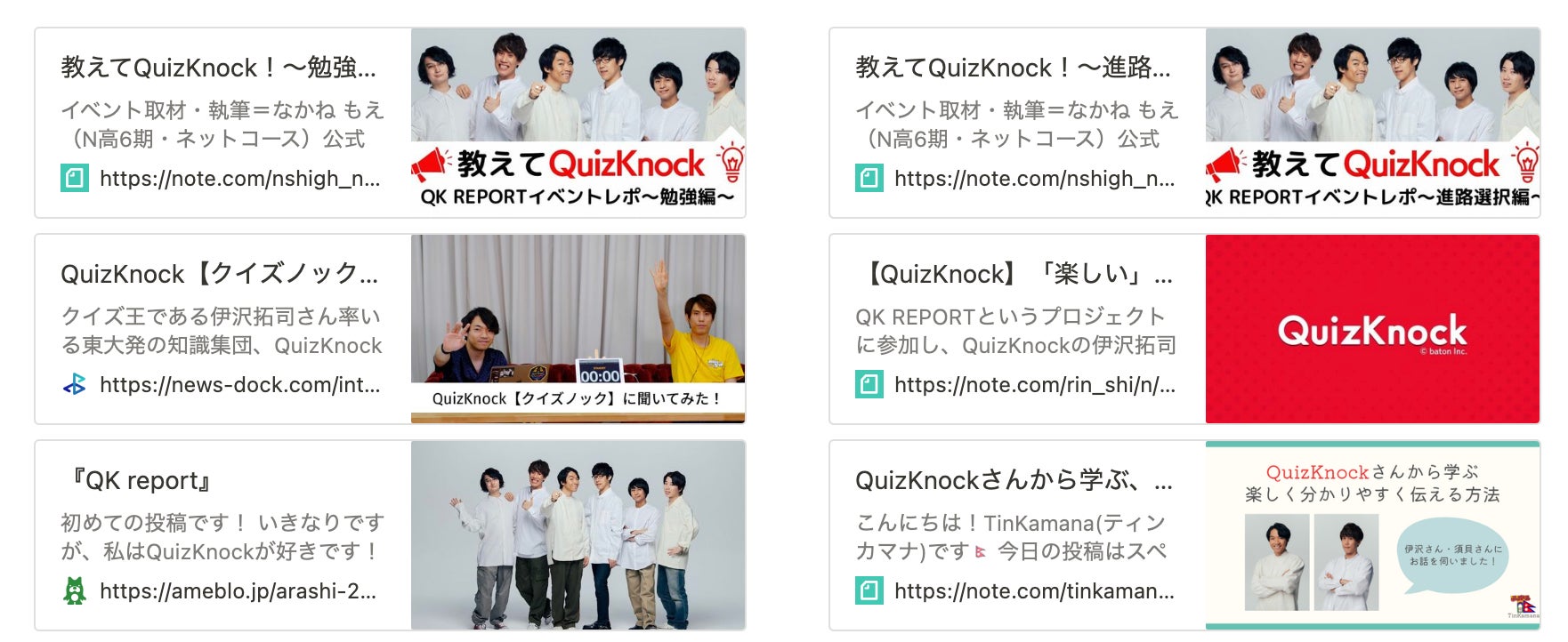 本日公開された記事まとめページ「QK REPORT Archives」(https://baton8.notion.site/QK-REPORT-Archives-05cb47f1990649c087c58e8507ca0bf6)では、学生記者が作成した力作の数々をご覧いただけます。参加者それぞれがQuizKnockに対する思いや考えを綴った記事は30を超え、ファン巻き込み型の新しい形の広報施策としても注目と期待が高まっています。