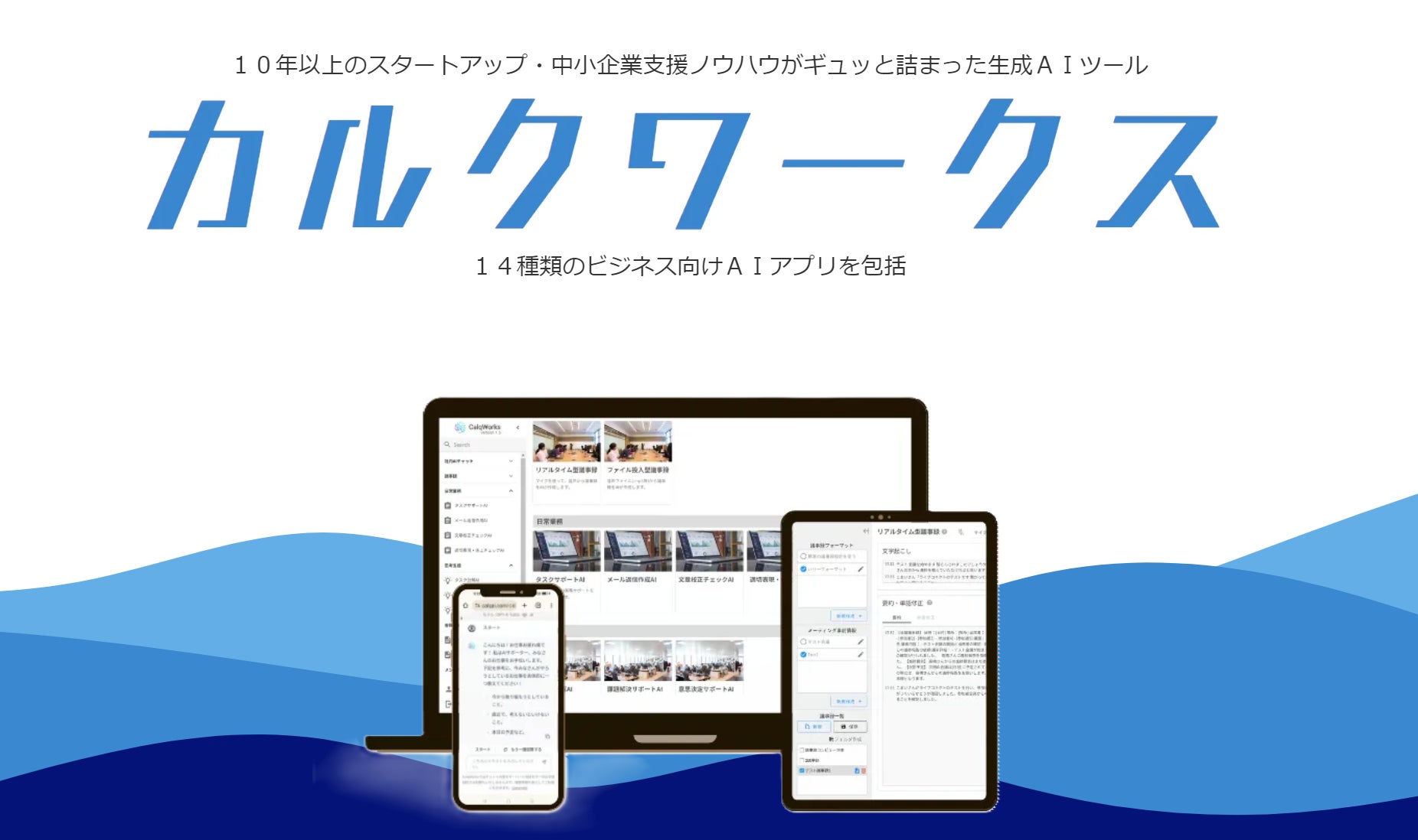 カルクワークス:議事録や補助金申請書など、各種ビジネス文書を数分で自動生成できる多機能生成AIツール群です。プロンプトの学習は不要で、誰でもすぐに使いこなせる設計を実現。中小企業の実務に最適化されたアプリケーションで、人手不足の解消と業務効率化を強力にサポートします。