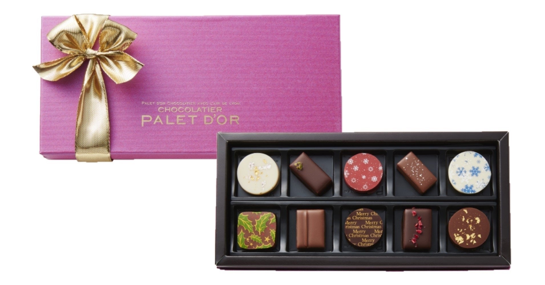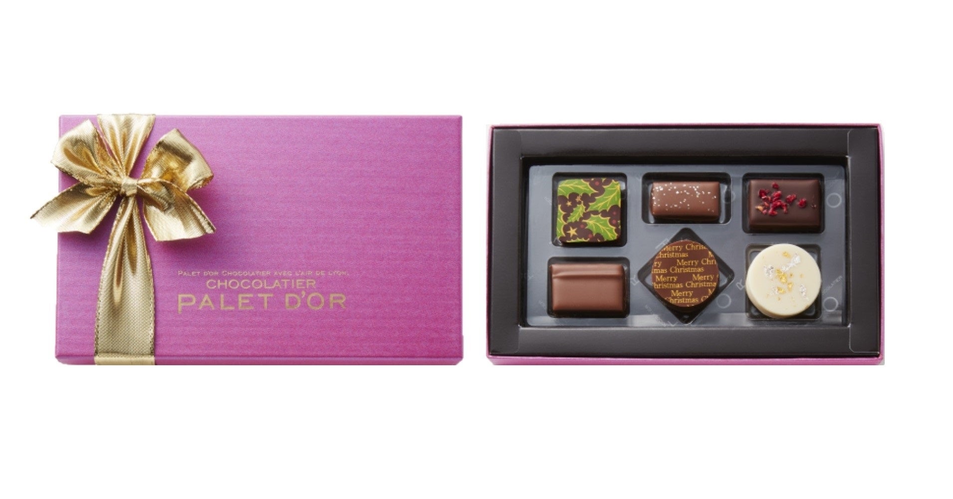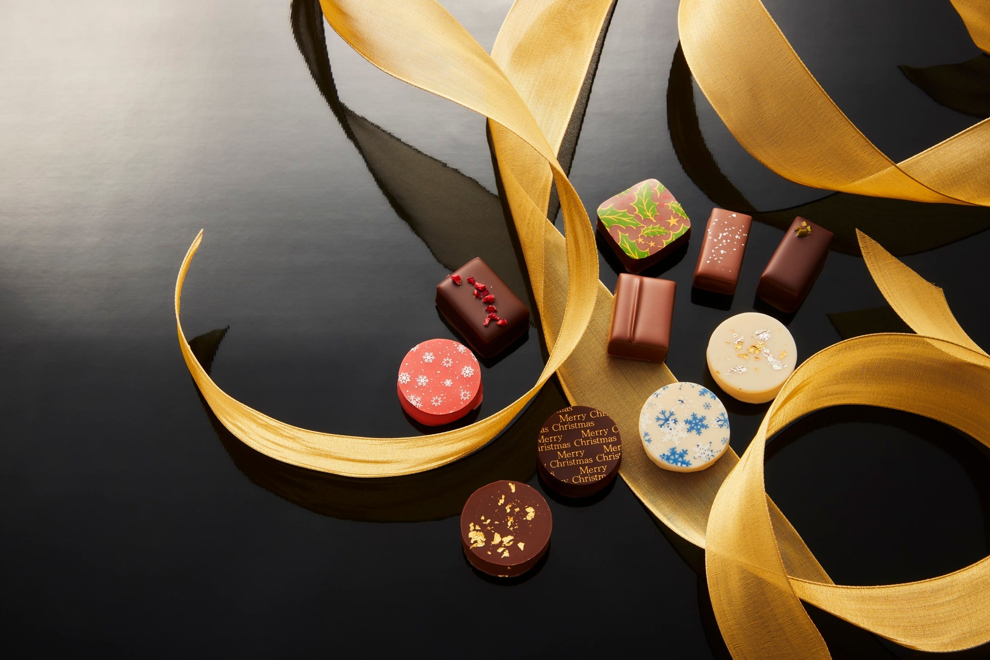 鮮やかなピンクの箱に、煌びやかなゴールドのリボンでラッピングしたBOXには、Xmas模様にデコレーションしたスペシャリテのパレドオールや、クリスマスカラーイメージのピスタチオとフランボワーズのチョコレートなど人気のショコラを詰め合わせました。箱を開けた瞬間にクリスマス気分が上がる「コフレ ノエル」は、ちょっとしたプレゼントや、この1年頑張った自分へのご褒美にもぴったりのコフレです。美味しいショコラで、ホリデーシーズンをお楽しみください。