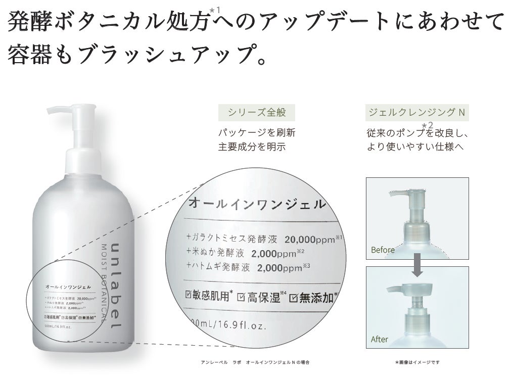 *1 アンレーベル モイストボタニカル ジェルクレンジングR(当社従来品)と比較 *2 一般的なグルー(シアノアクリレート系)をご使用の場合 *3 油性マスカラが落とせること *4 洗い流すクレンジングと比較して短時間でメイク落としができること *5 アンレーベル モイストボタニカル ミセラークレンジングR(当社従来品)と比較 *6 フィルムタイプマスカラが落とせること *7 気になる部分へ集中的に使用 *8 アンレーベル モイストボタニカル クレンジングバーム(当社従来品)と比較 *9 当社内比 *10 ガラクトミセス培養液、サッカロミセス/コメヌカ発酵液エキス、サッカロミセス/ハトムギ種子発酵液(すべて整肌成分) *11 アンレーベル モイストボタニカル 洗顔フォームRN(当社従来品)と比較 *12 汚れや古い角質による *13 古い角質による *14 肌にうるおいを与え、乾燥により目立った毛穴を目立たなくすること *15 アンレーベル モイストボタニカル 化粧水RN(当社従来品)と比較 *16 アルテア根エキス、カミツレ花エキス、セージ葉エキス(すべて保湿成分) *17 肌にうるおいを与え、乾燥により目立った毛穴を目立たなくすること *18 乾燥してキメが乱れた肌にうるおいを与えること *19 アンレーベル モイストボタニカル オールインワンジェルRN(当社従来品)と比較