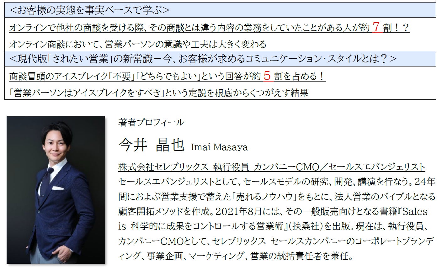 営業に関するコンサルティングや代行などを行う株式会社セレブリックスは、この度、執行役員 カンパニーCMO/セールスエバンジェリスト今井晶也の書籍「お客様が教えてくれた されたい営業」を7月22日(金)に発売します。今回発売する書籍は、顧客が“されたい営業”は何なのか、約1,000名の購買者の声を元に生まれました。