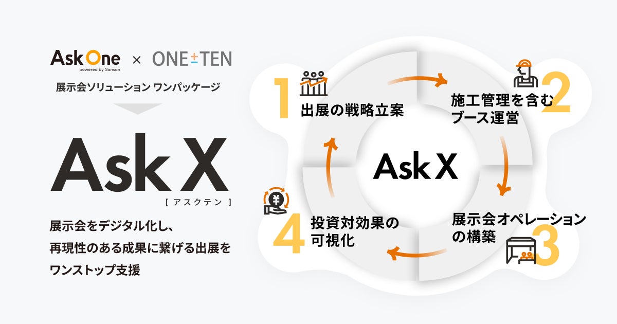 まずは両社が既に提供しているサービスをワンパッケージ「Ask X(アスクテン)」として共同提供いたします。データに基づく展示会の出展戦略立案及び出展コスト最適化、「Ask One」を活用した展示会における現場オペレーションの定量化、リアルタイムで成果を計測することでPDCAを回せるオペレーション環境の構築を実現します。展示会に複数回出展する企業が、再現性を持って展示会の投資対効果を最大化できるよう出展戦略からオペレーションまでワンストップで支援してまいります。