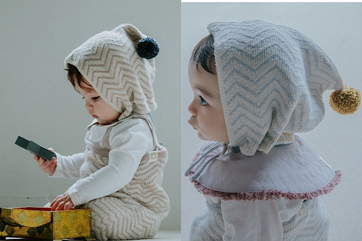 ホールガーメント製法での柄表現に挑戦したcardiganとknit pants、knit bonnetの新デザインyamaji momo・yamaji mizuは、何度も微調整を重ねた末に実現したクラフツマンシップの凝らされたアイテムです。