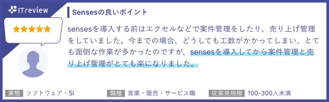 ITreviewにて、Sensesを実際に利用いただいているお客様よりたくさんのお声をいただいております。利用者からは「操作が簡単で分かりやすい」「案件管理や売上管理が楽になった」などのコメントをいただきました。