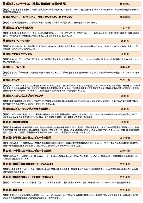 プログラミングの体験を通して、プログラムの働きや良さに気づかせる、というプログラミング教育のねらいを達成するには、教える側がコンピュータが動く原理を理解しておく必要があります。特に小学校での指導では、教える側が必ずしもコンピュータサイエンスのスペシャリストであることは必須ではありません。ですが、教える側は少なくともコンピュータのことを理解し、普段のICT活用の中での指導に活かすことが求められ、プログラミングの授業では、なおさら必要となります。今回のカリキュラムは、そうした実践的な授業設計に繋がる最初の一歩として、理系文系問わず教職課程の学生の皆さんに、必要な内容を厳選しています。また、教職課程ではない皆さんでも、このカリキュラムを通して学習することで、普段スマホなどを使っていて、なんでだろう、と不思議に思ったことがすっきりできるのではないでしょうか。カリキュラムの各回は、独立した内容になっています。目的に応じてピックアップしてお使いください。