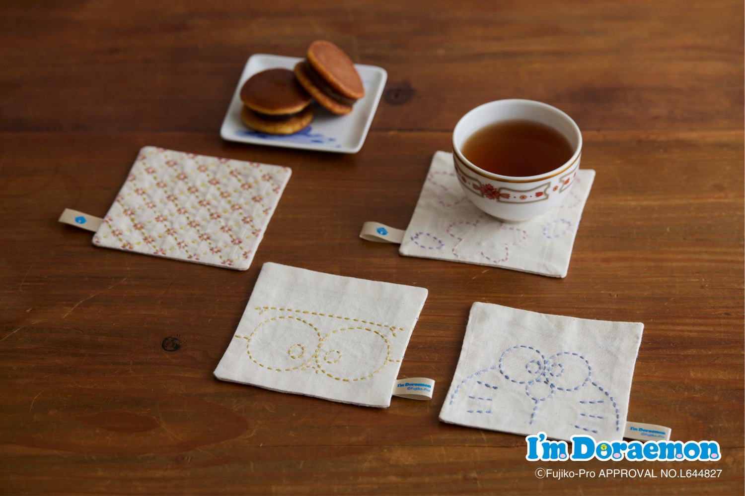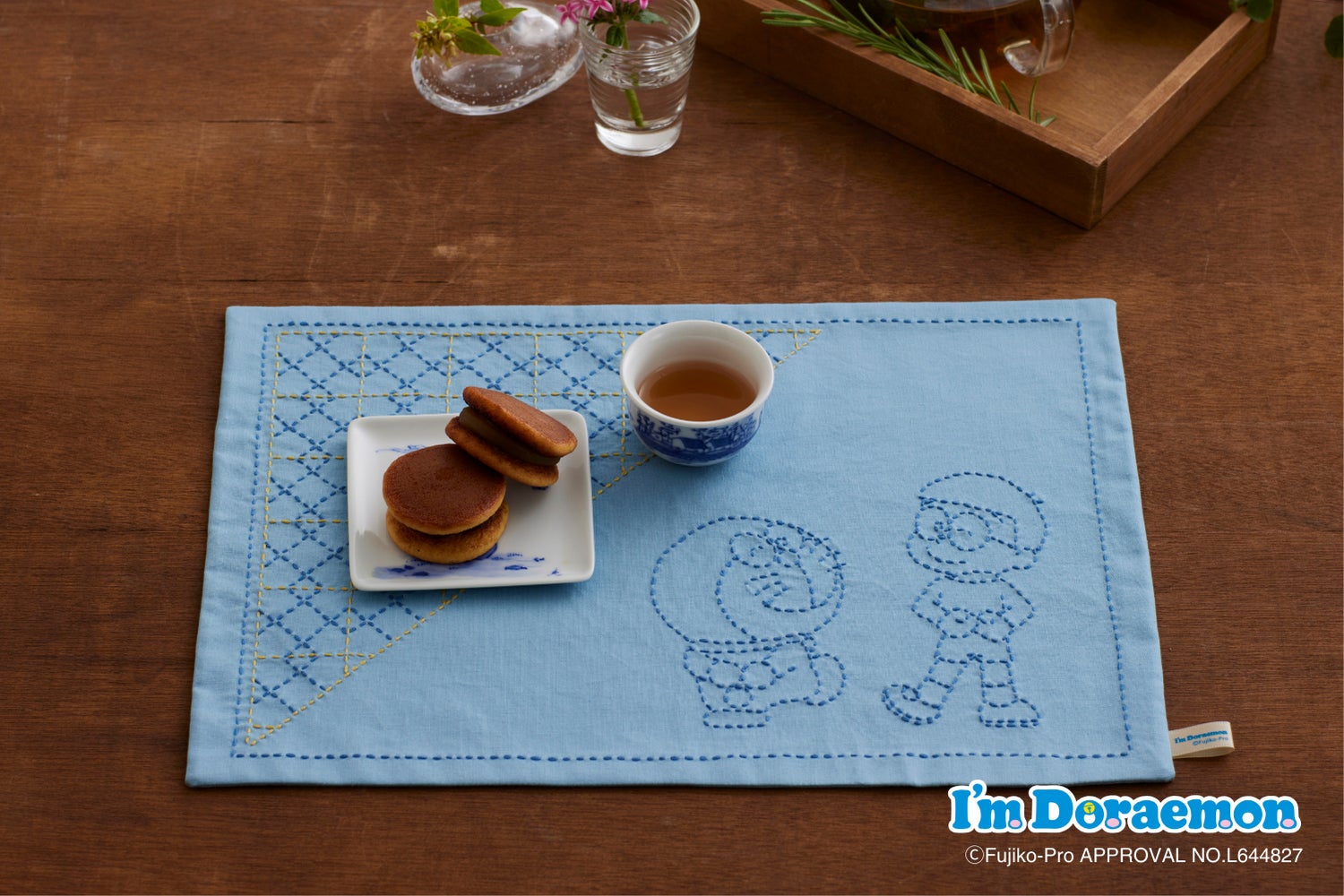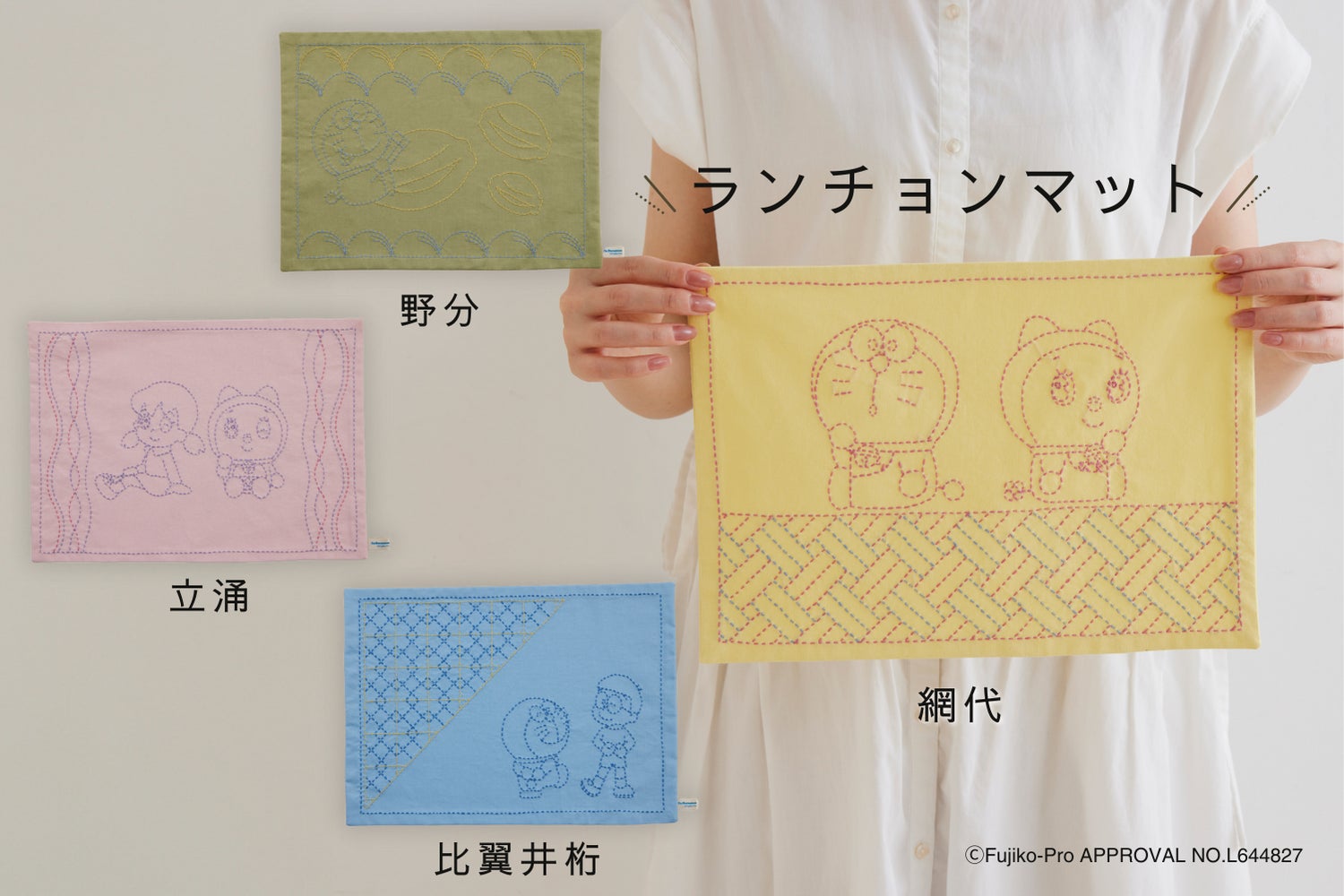 ドラえもんの仲間たちと和柄をデザインした刺し子の小もの。それぞれに意味のある、縁起のよい日本の伝統文様との組み合わせを楽しめます。アイテム展開は気分に合わせて選べるふきん、コースター、ランチョンマットの3種です。