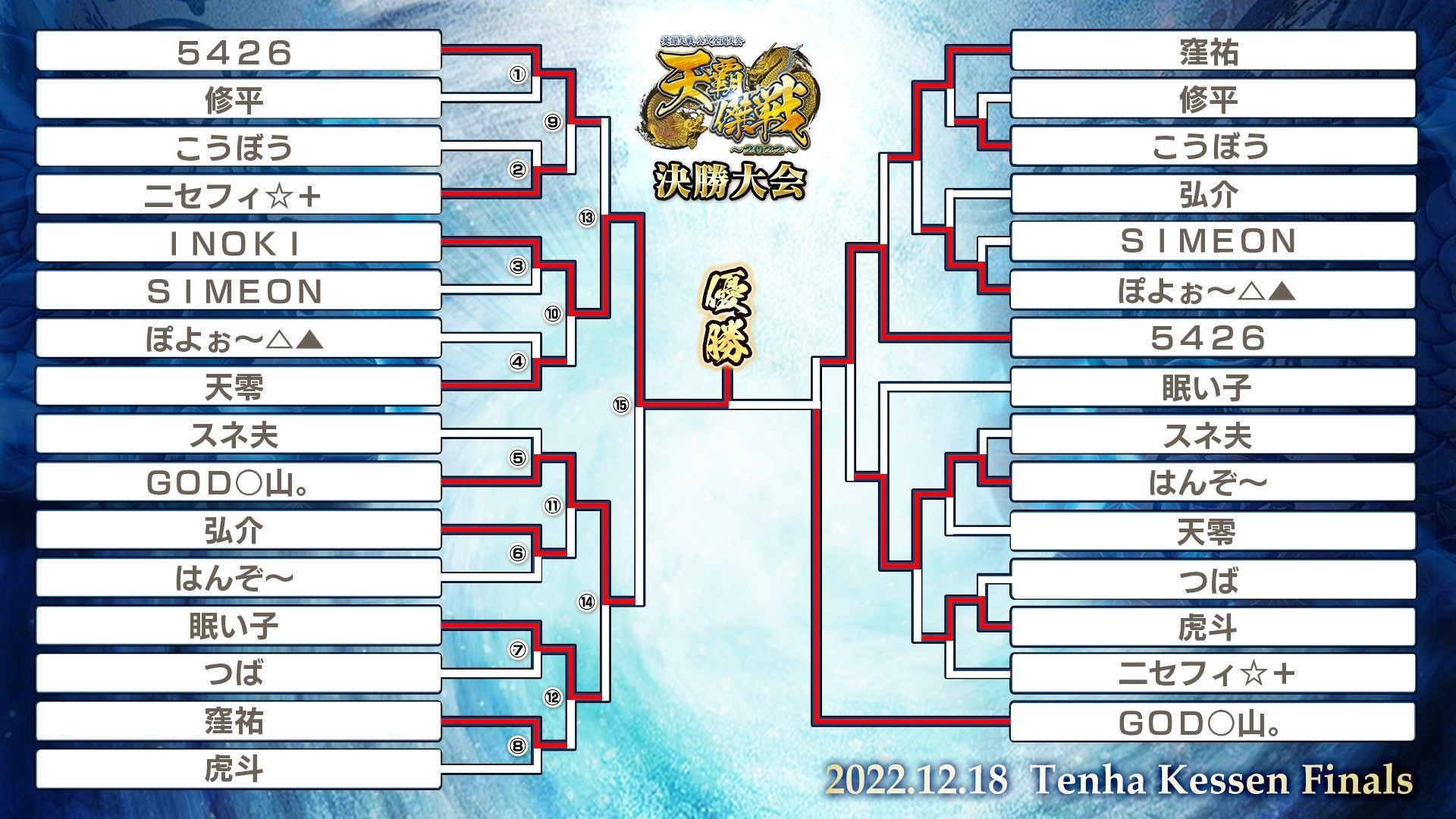 「天覇傑戦 2022」決勝大会は7月に開催された「感謝の宴2022 in東京」1DAYトーナメント優勝者をはじめ、全国一斉オンライントーナメントの優勝者、累計ポイント選抜、1DAYトーナメント西日本優勝者、全国主君ランキングの上位選抜から選出された、全16名の主君による熱いトーナメントが繰り広げられました。