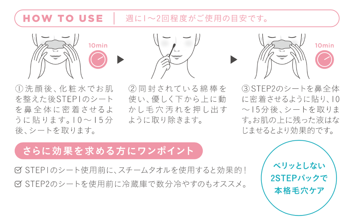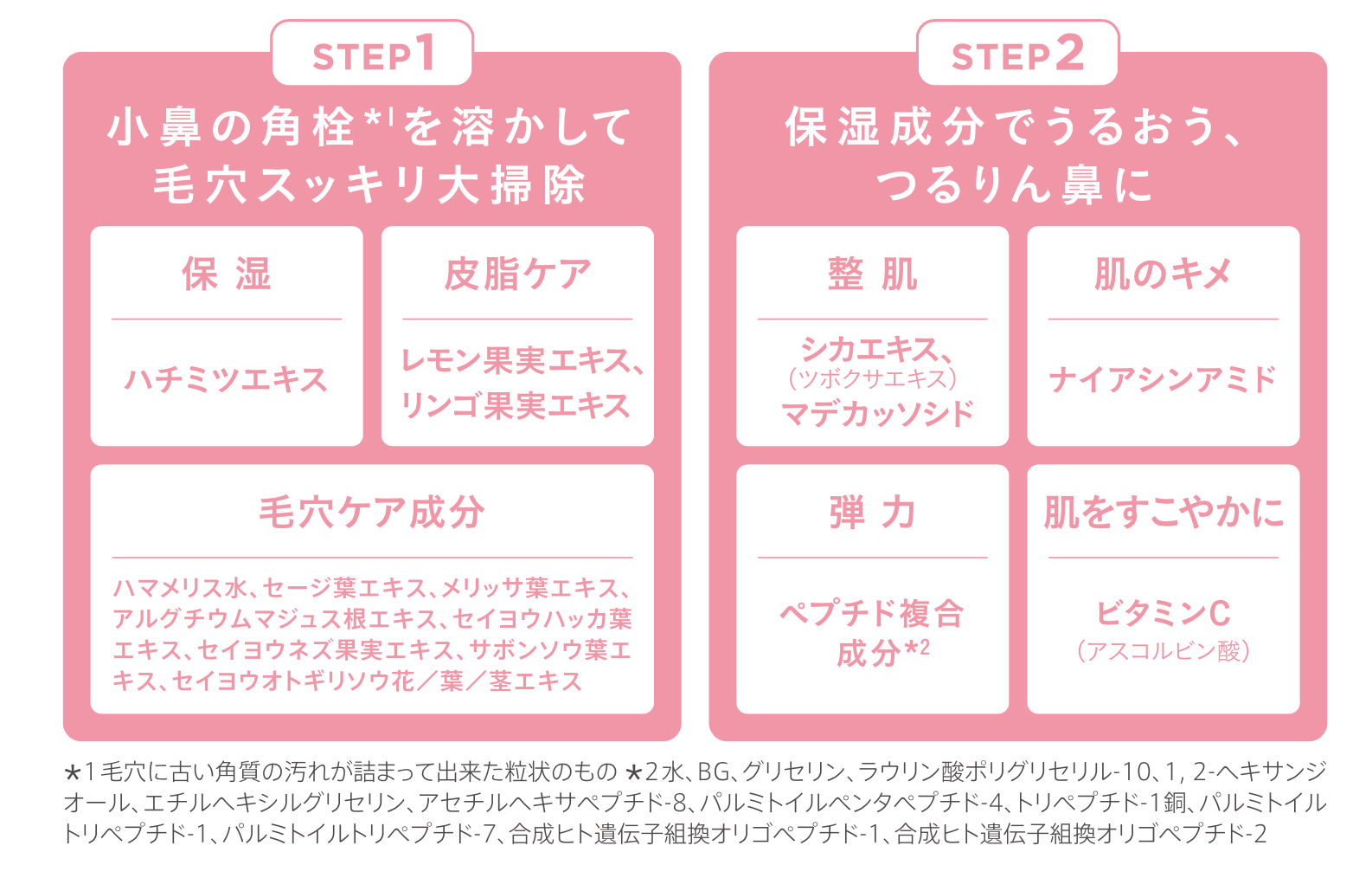 従来の鼻パックとは違い、粘着しないタイプの鼻パック。肌に負担をかけない新しい毛穴ケア商品です。毛穴汚れを溶かしたあと、保湿でしっかり肌を労る2ステップ式で簡単かつ本格的な毛穴ケアが自宅で手軽に楽しめます。