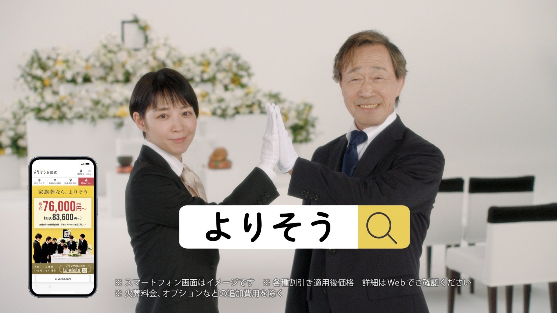 新CMでは、武田鉄矢さんと吉谷彩子さんに「よりそう」のサービスを提供するセレモニースタッフ役として出演いただいております。お葬式が初めてで不安なお客様を最初から最後までサポートする「よりそうお葬式」を紹介し、不安によりそう姿勢やサービスのコンセプトをご理解いただければ幸いです。また、「よりそう」というサービス名を、親しみを持って覚えていただけるよう「よりそうポーズ」を前回に引き続き表現いたしました。