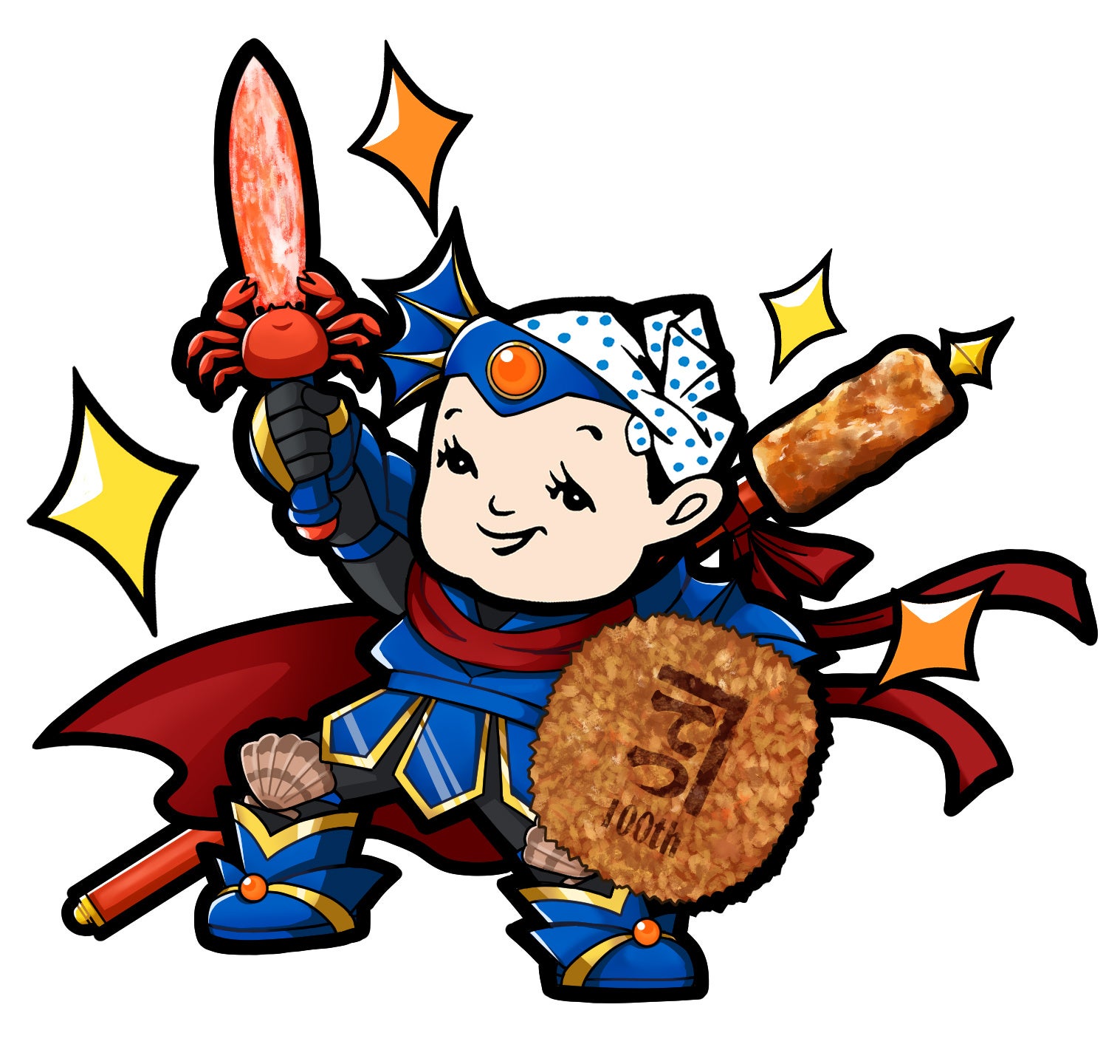 カネテツデリカフーズ創業100周年記念キャラクターとして、カネテツ王国の勇敢な戦士「勇者てっちゃん」が登場。「ほぼカニ®」や「野菜フライ」等のカネテツ商品をモチーフにした装備を身に着けた「勇者てっちゃん」が、創業100周年を盛り上げます。