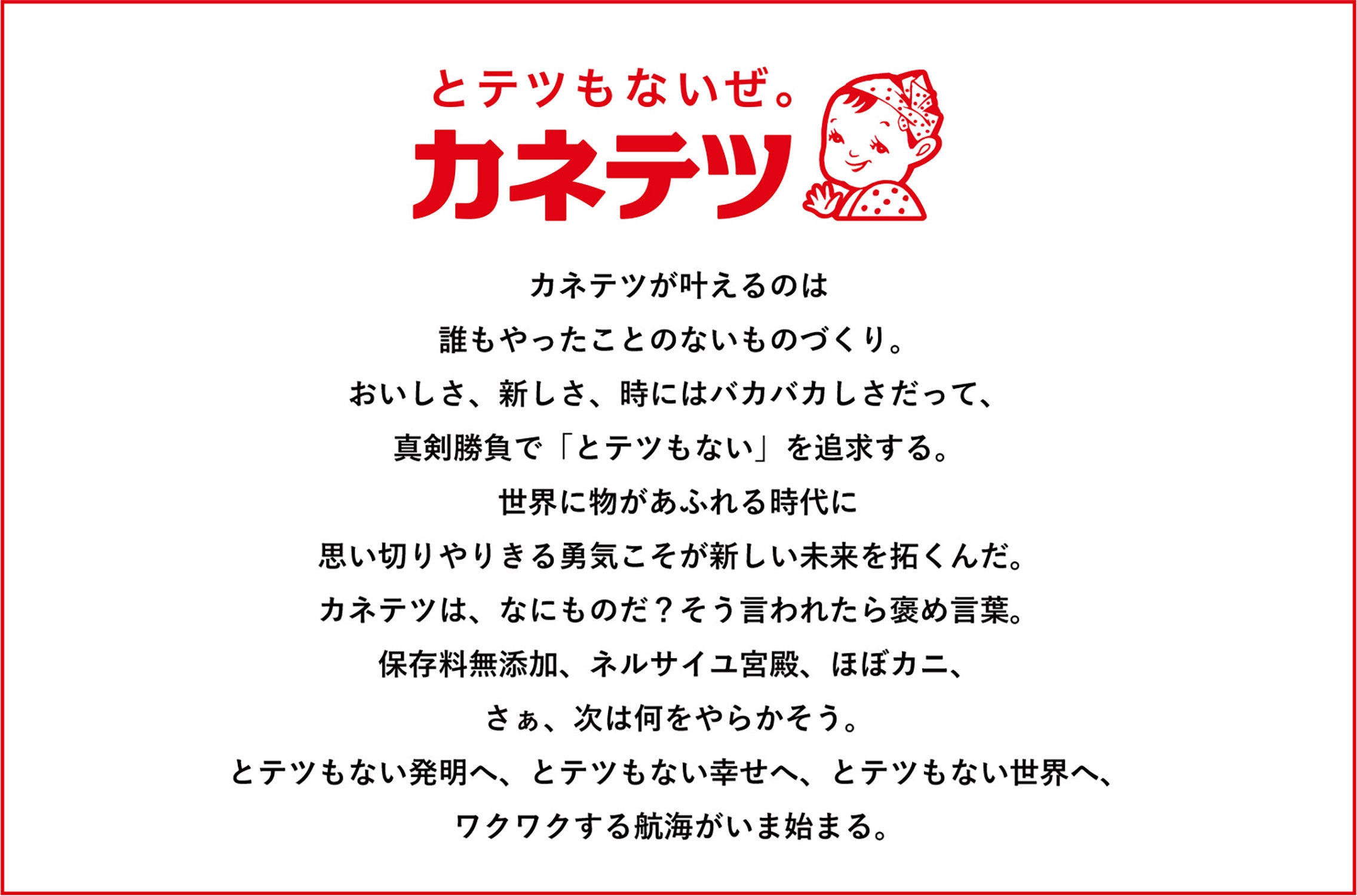 次の100年も、カネテツデリカフーズは、“とテツもないぜ。”をスローガンに、カネテツならではの価値(らしさ)を磨き続け、海を通じ、皆さまの暮らしに「幸せを灯せる企業」として、さらなる挑戦を続けてまいります。