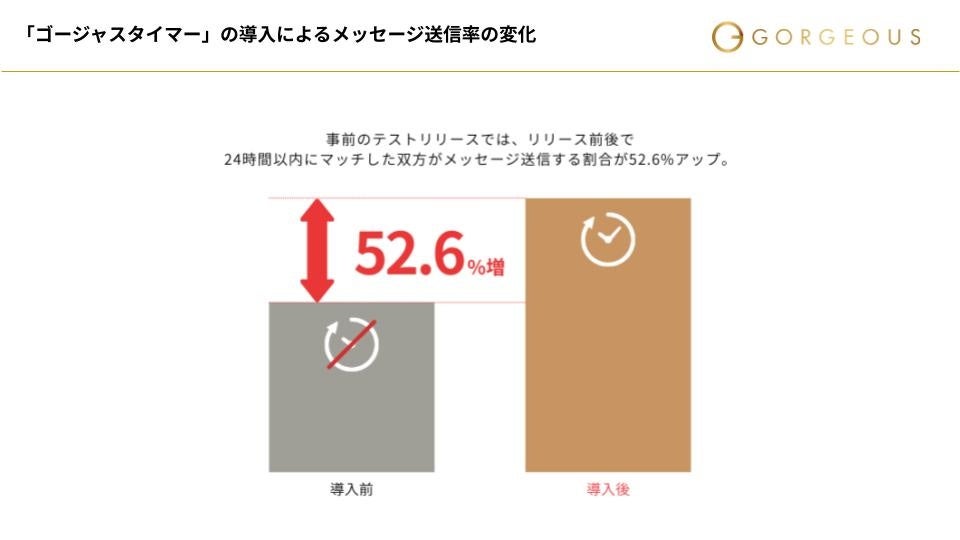事前にテストリリース(計測期間:2週間)をしてみたところ、24時間以内にマッチした双方がメッセージ送信する割合は、リリース前と比較して52.6%アップしました。
