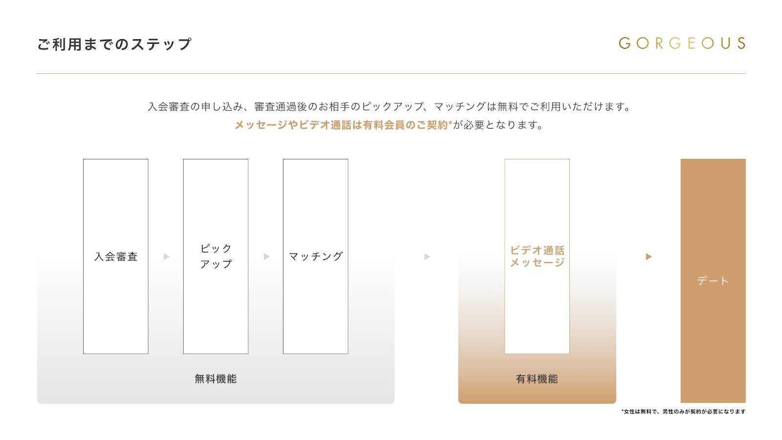 2022年10月サービスリリース。ゴージャスは、ハイクラスなお相手と出会いたいと考える男女をターゲットとした、「憧れの出会い」を実現する完全審査制の恋活・婚活マッチングアプリです。