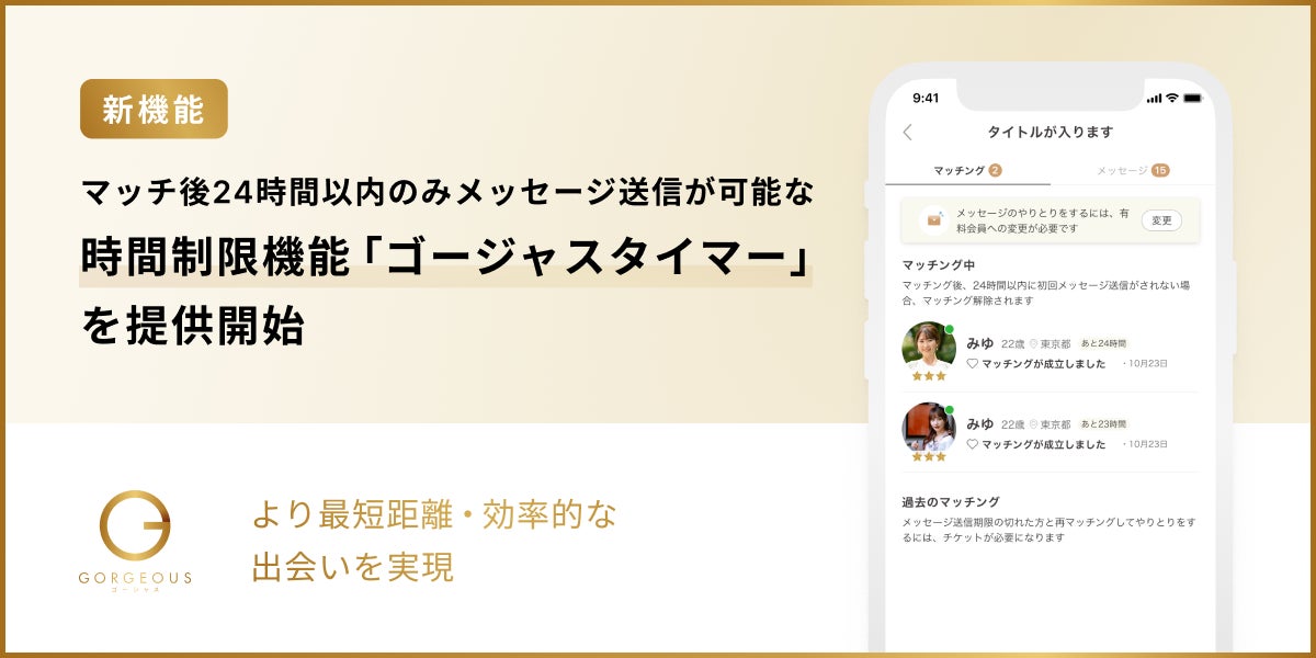 【新機能】マッチ後24時間以内のみメッセージ送信が可能な時間制限機能「ゴージャスタイマー」を提供開始
