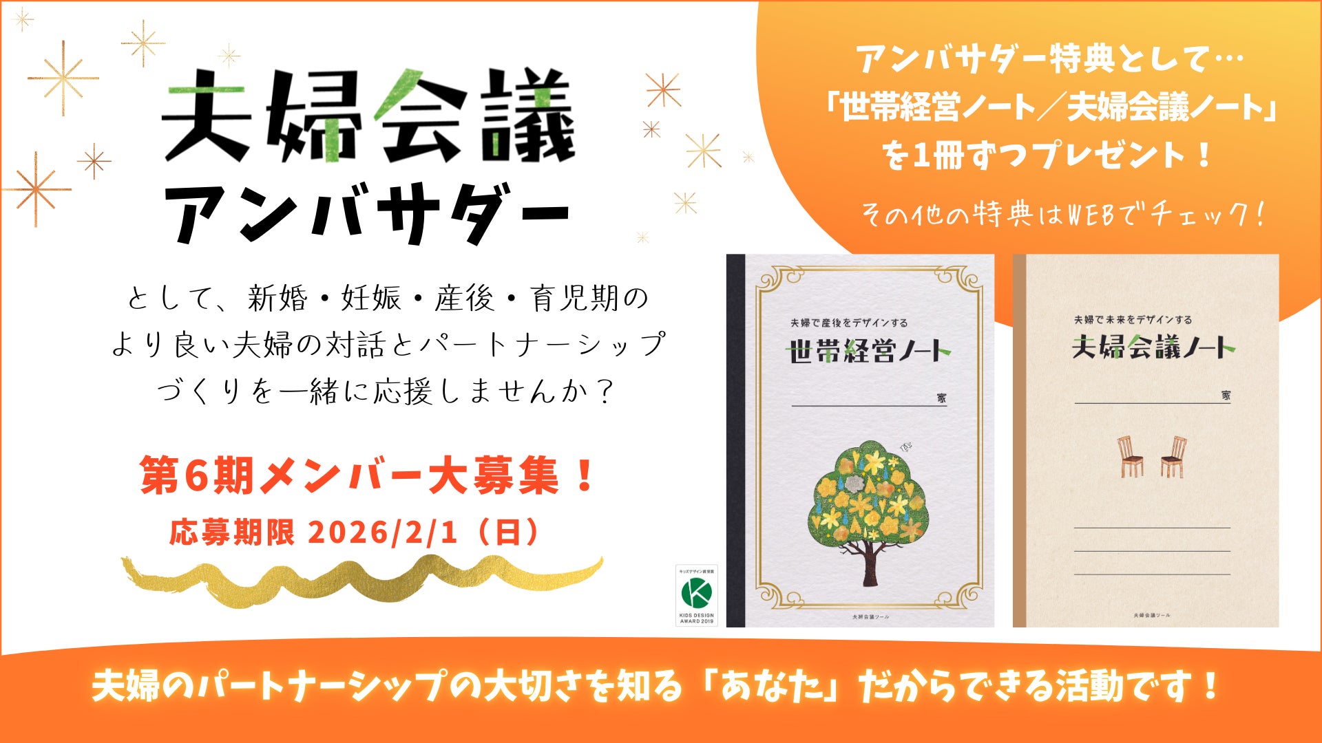 キッズデザイン賞受賞の夫婦会議ツール「世帯経営ノート」のプレゼントなど、特典いっぱいな『夫婦会議アンバサダー®』活動の詳細と募集内容を以下でご紹介します。