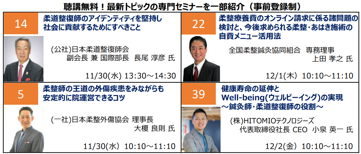施術所の経営・運営で役立つ技術・商品・サービス、無料で聴講できる専門セミナープログラムなど、施術業界の最新動向を学べる貴重な機会として、是非本展を役立ててほしい。