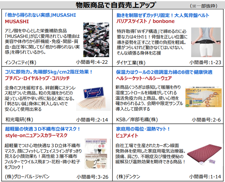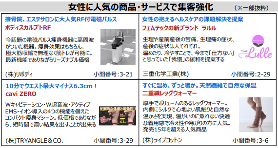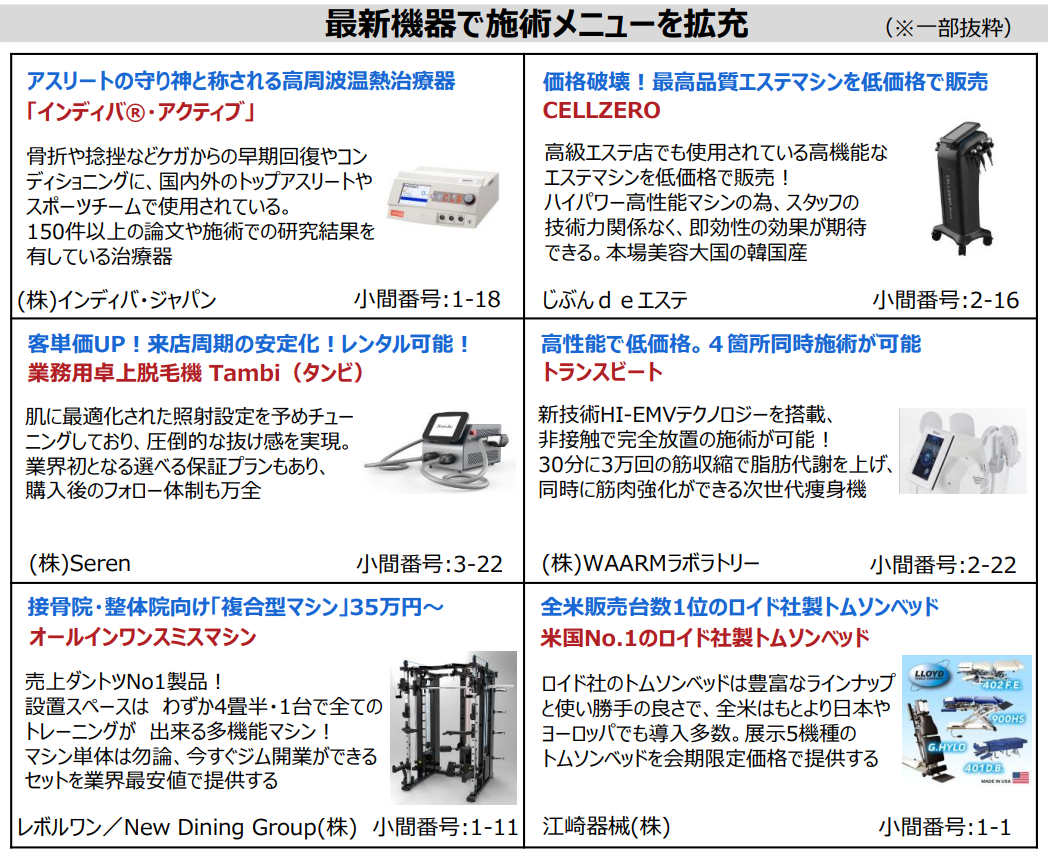 例えば、自費メニュー提供のための治療器・美容機器・物販商品や、経営を効率化出来るシステムなど、競争の激しい施術業界を生き抜くプロにとって、見逃せないものばかりだ。
