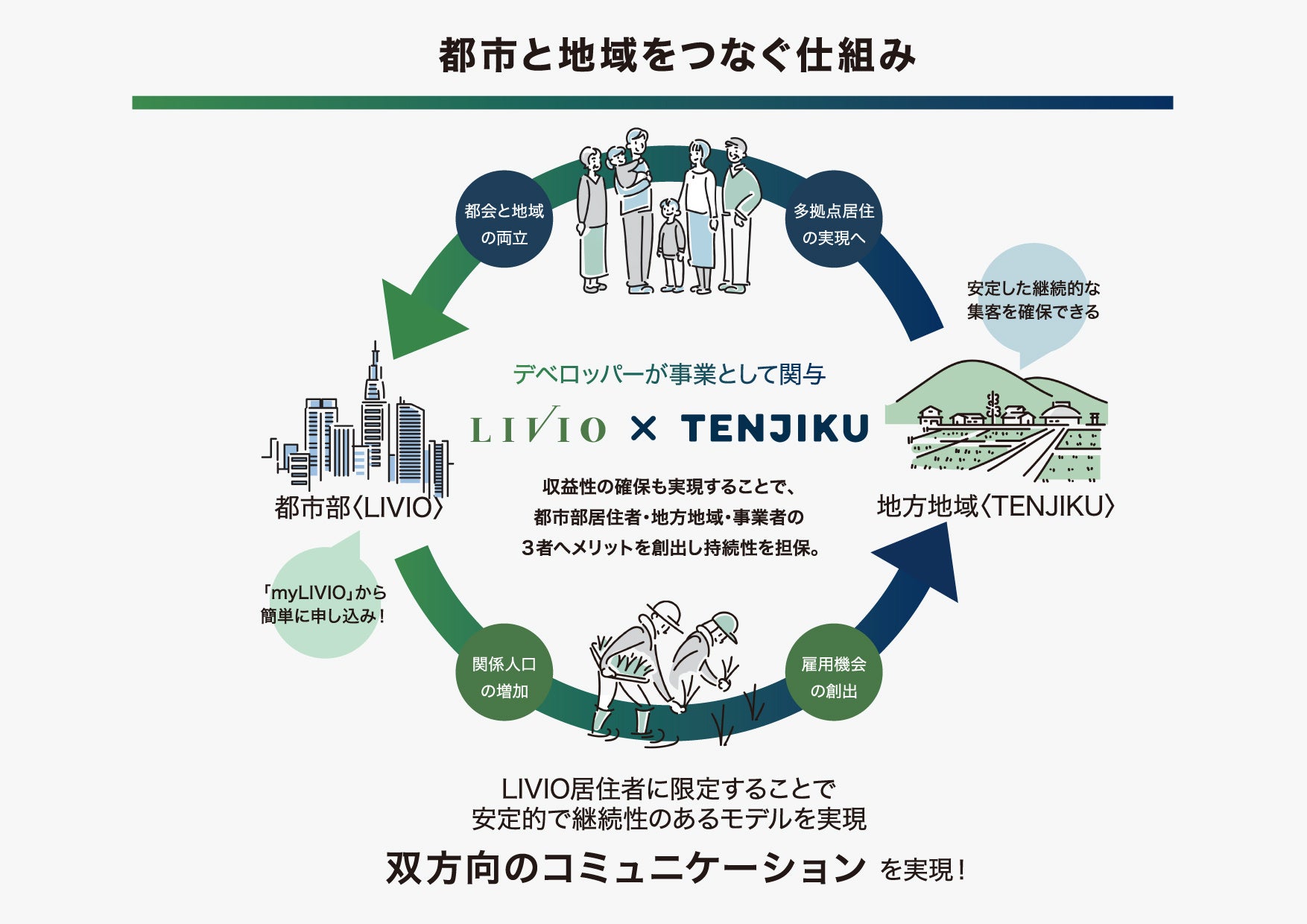 『LIVIO×TENJIKU』は、都市部居住者×地域共創の新モデルとして、都市部のマンション居住者が単なる観光を超えて地域に深く関わるライフスタイルを実現する取り組みです。宿泊と自然体験イベントを組み合わせ、「地域をマンションの共用部として活用する」という発想により、都市と地域資源のあいだに継続的な往来と学びの循環を生み出します。
